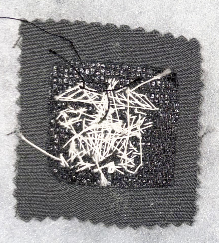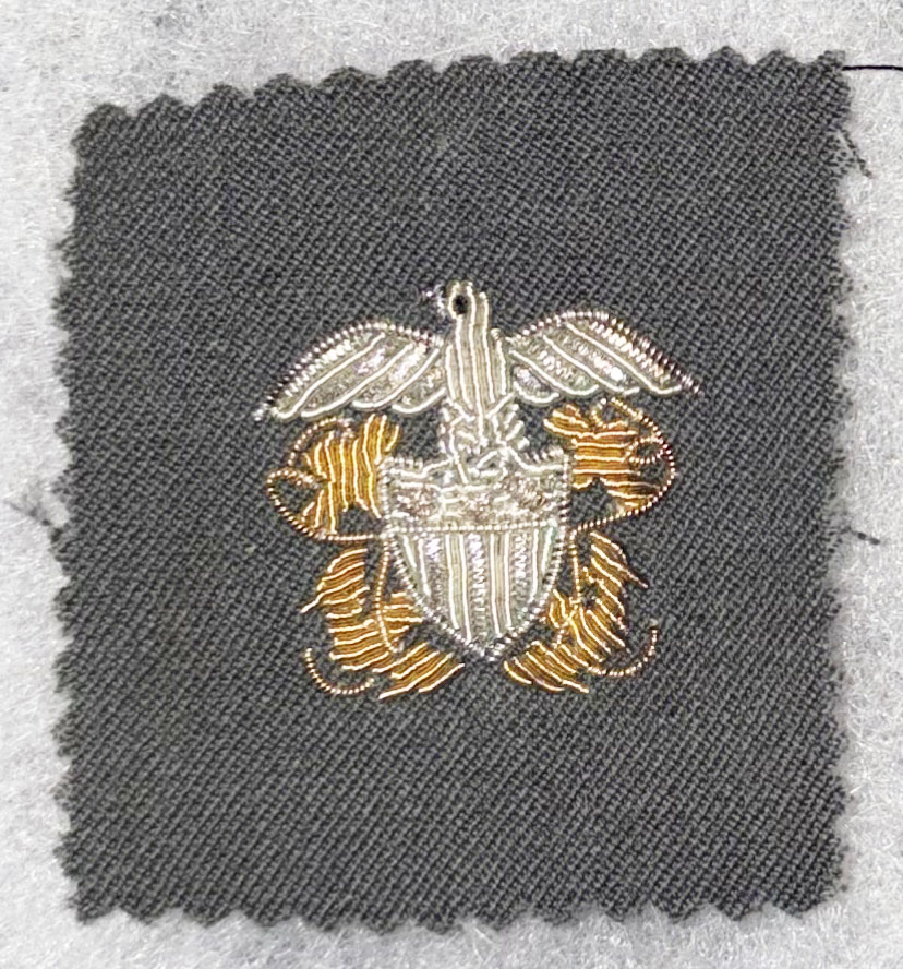 WWII US Navy Officers Bullion Overseas Cap Patch On Grey. Grey gaberdine background with thick gold and silver bullion embroidered details. Unused.