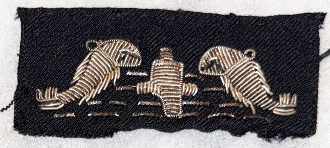WWII US Navy Submarine Bullion Dolphins Patch. Black wool like background with silver bullion embroidered details. Used.