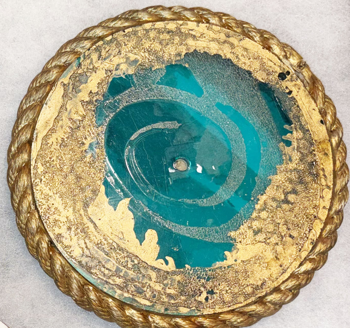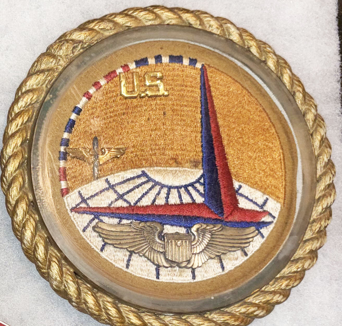 WWII AAF Air Ferrying Command Pilots Insignia Display. About six and a half inches in diameter. Has a fully machine embroidered AFC squadron patch. Pinned to it is a winged prop and US collar device and a set of pilots wings. It is then all sealed in a lucite circle with a nautical rope border. Neat little display.