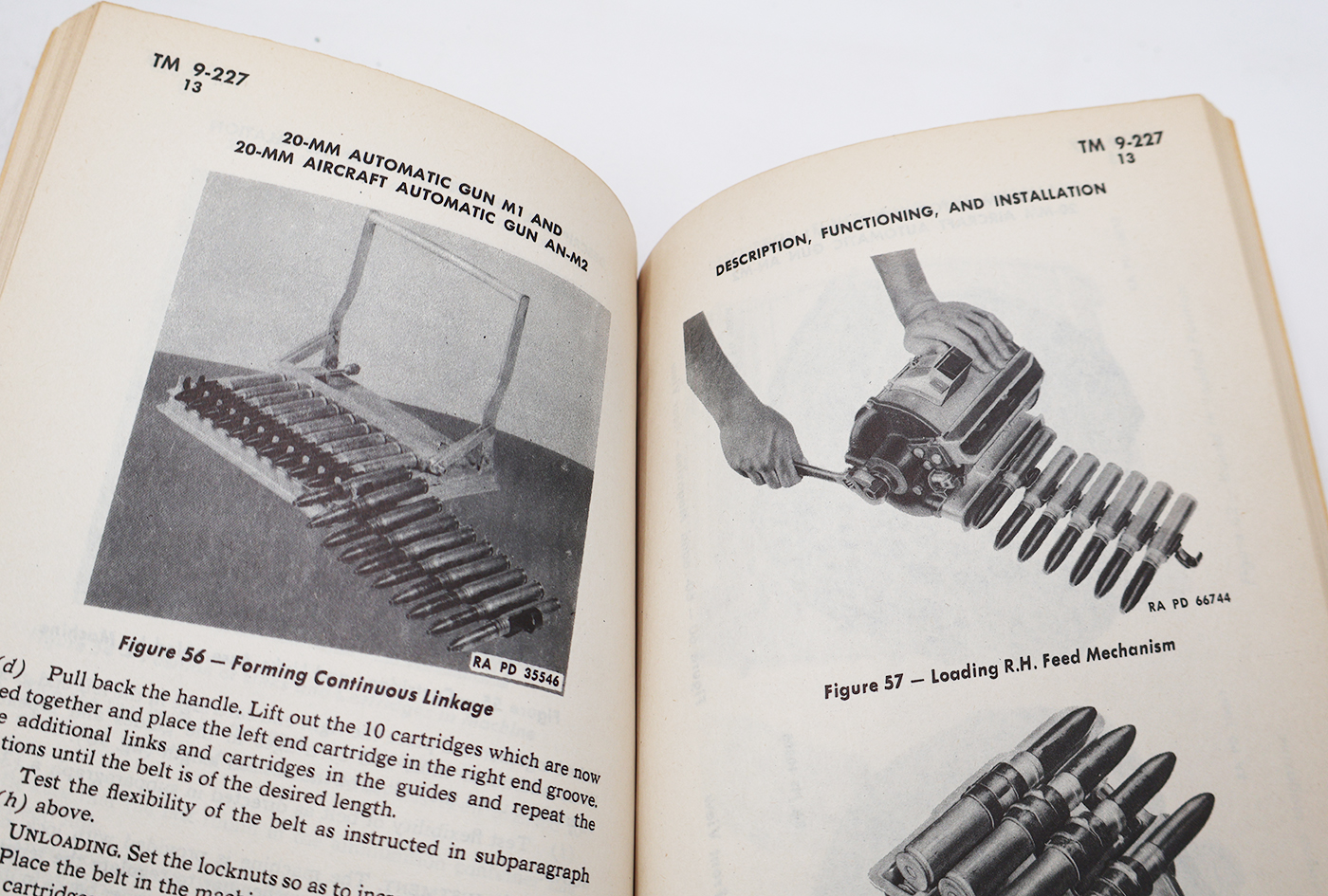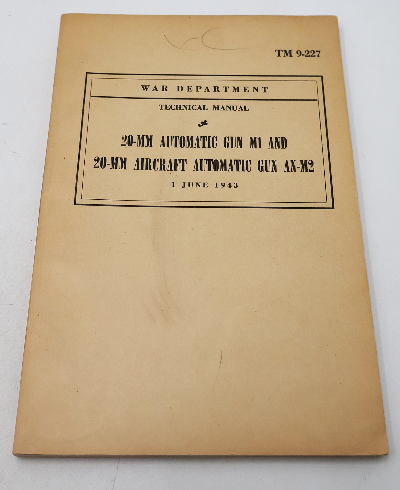 WWII US War Department Manual Handbook On the 20 MM Automatic Gun M1 and M2. Softbound. Dated 1943. Marked TM 9-227. 136 pages. Lots of great illustrations and photos. Wear to the cover, but pages and binding are strong. No torn or missing pages.