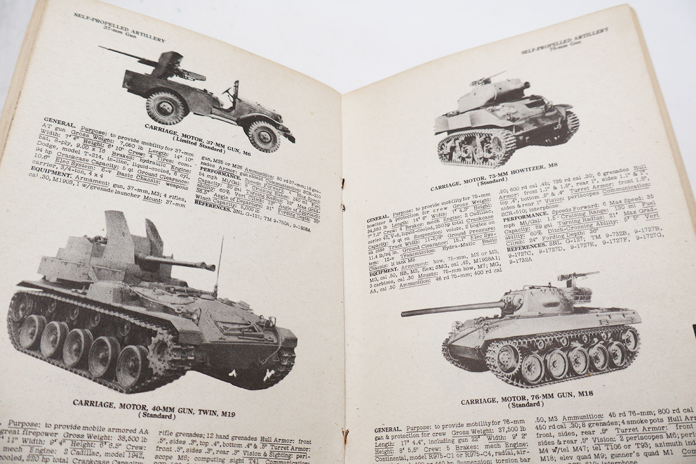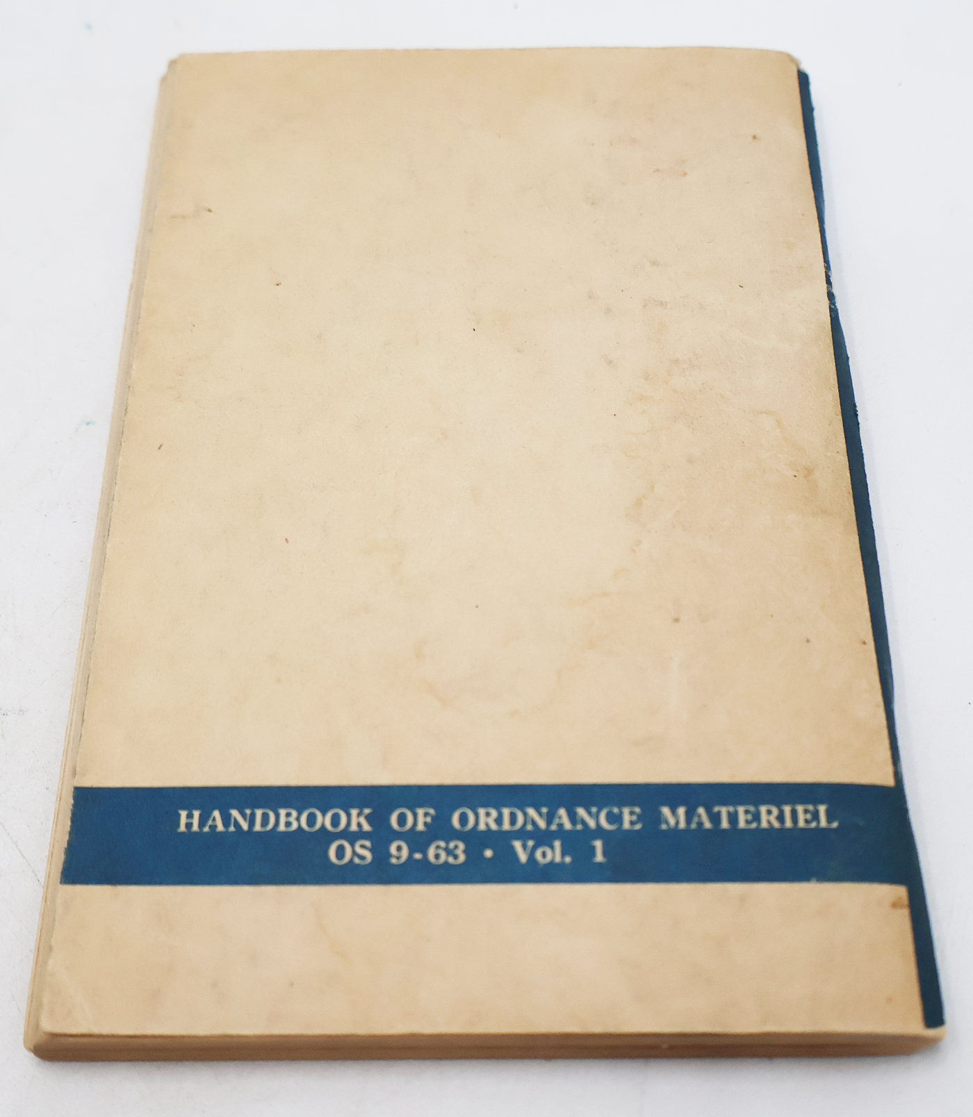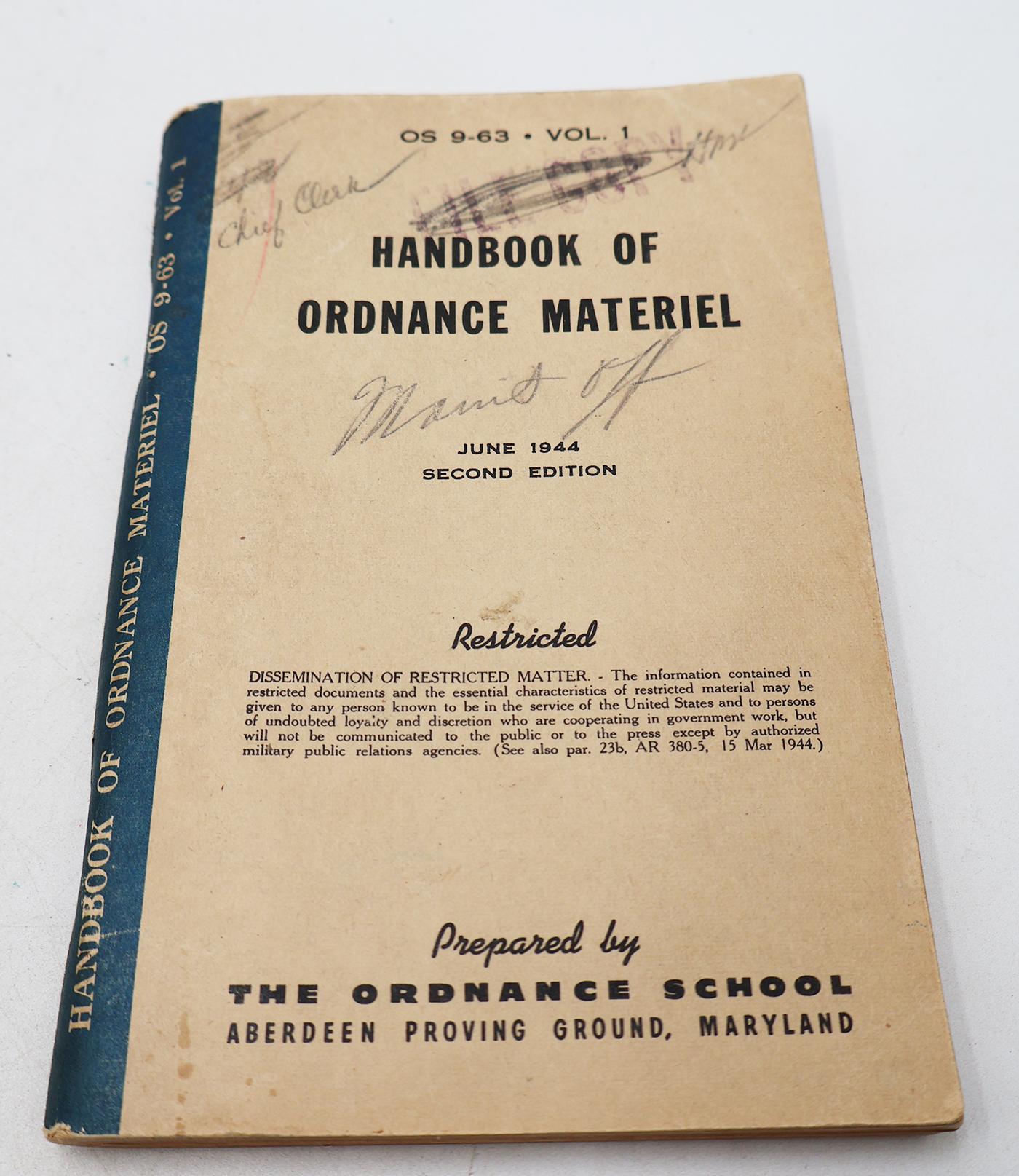 WWII US War Department Handbook of Ordnance Material. Softbound. Dated 1944. Marked OS 9-63. 128 pages. Lots of great illustrations and photos. Wear to the cover, but pages and binding are strong. No torn or missing pages.