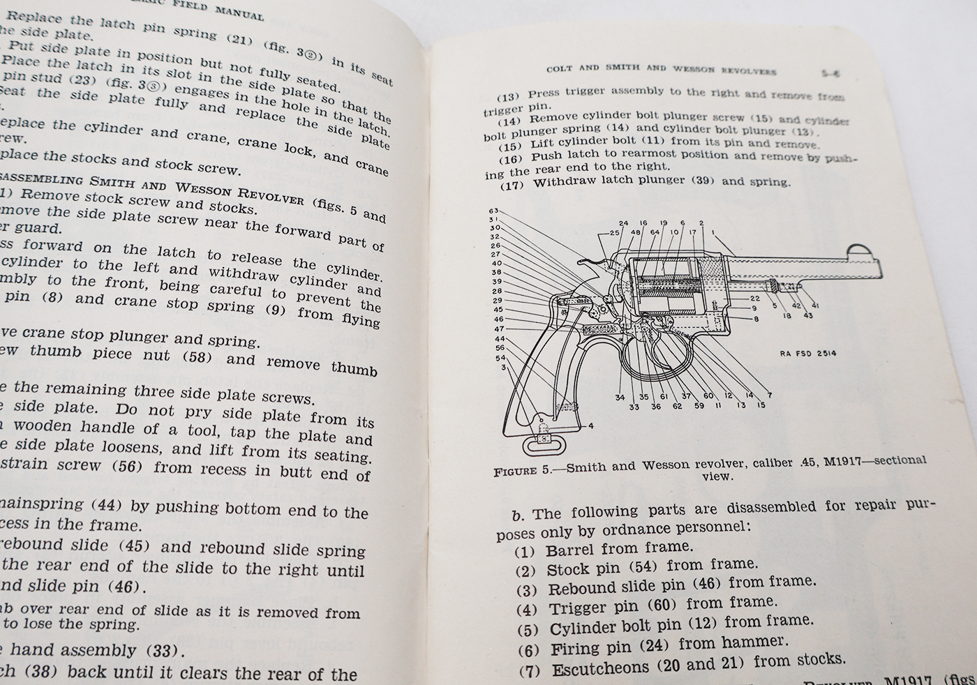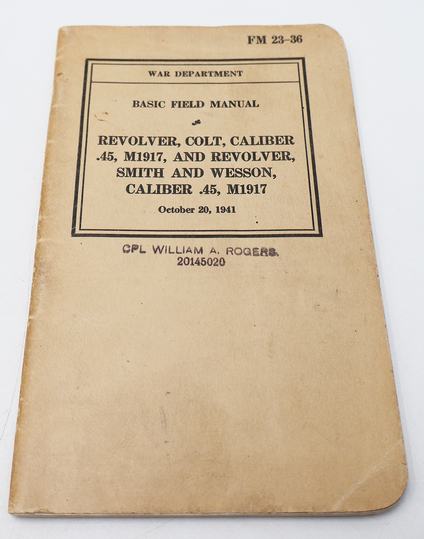 WWII US War Department Manual Handbook On the M1917 Colt and Smith & Wesson Revolver. Softbound. Dated 1941. Marked FM 23-36. 92 pages. Lots of great illustrations and photos. Wear to the cover, but pages and binding are strong. No torn or missing pages.