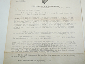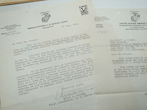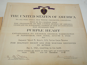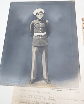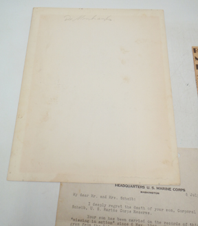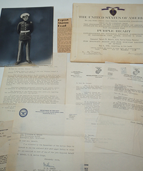 WWII era USMC Killed In Action on the Last Day of Corregidor Grouping. Grouping comes with portrait, Purple Heart Certificate and correspondence from Marine Corps, Navy and Veterans Administration regarding his death. All of the paperwork is in good condition with no torn or missing parts. Portrait measures 8 x 10 inches. Corporal Scheib was killed in action on the day the Japanese captured the Island of Corregidor. He was among the final casualties of the Fall of the Philippines.
