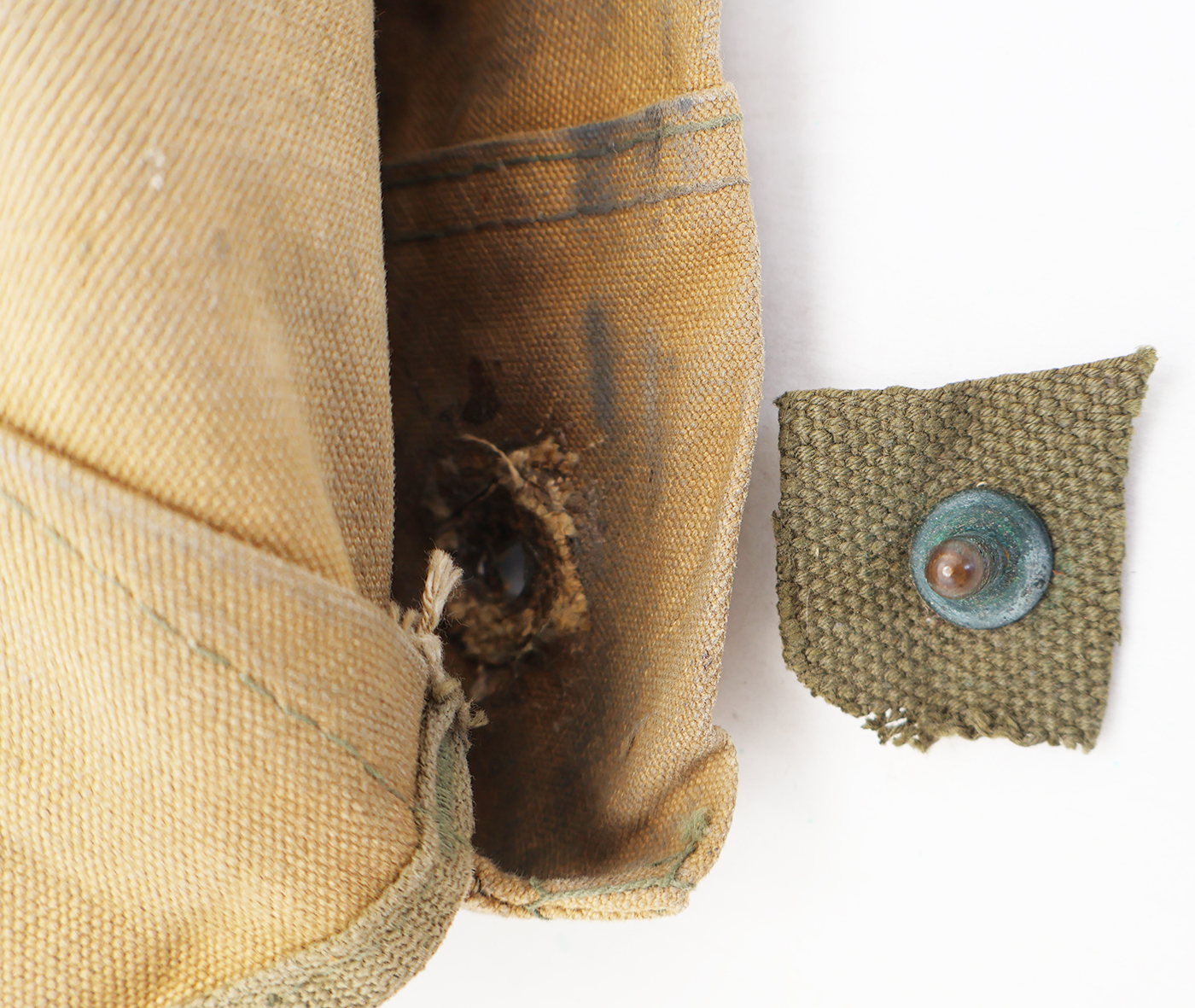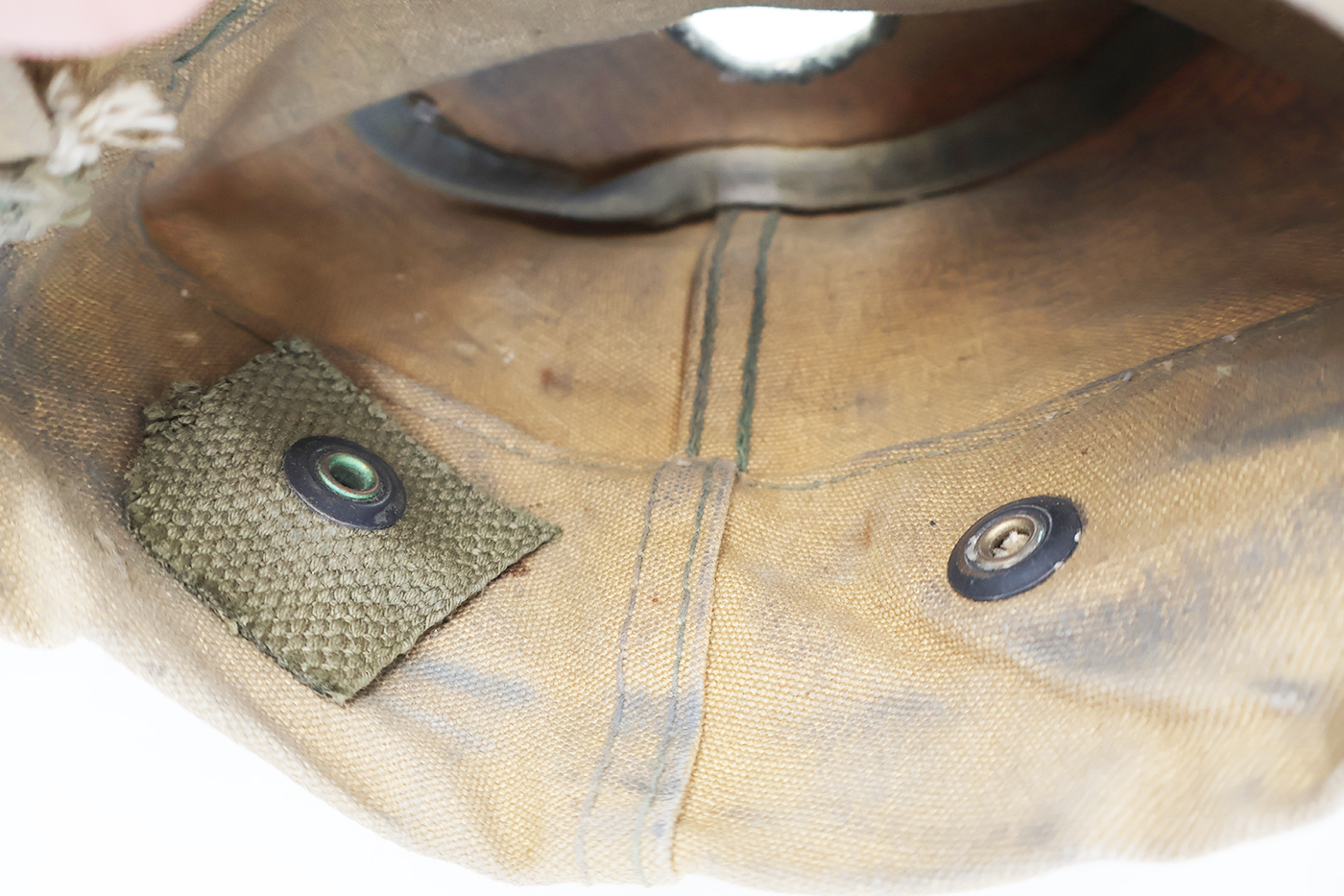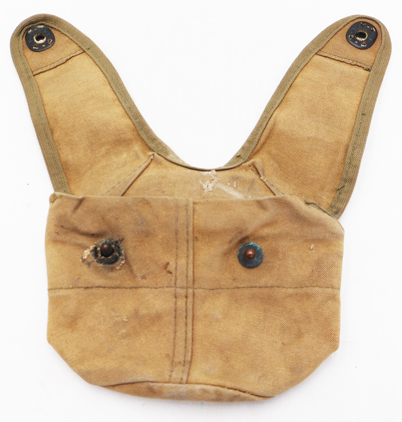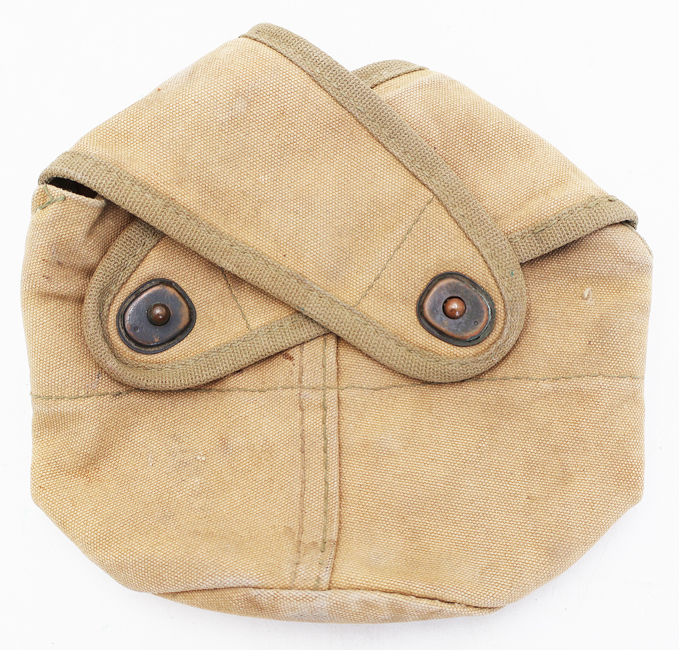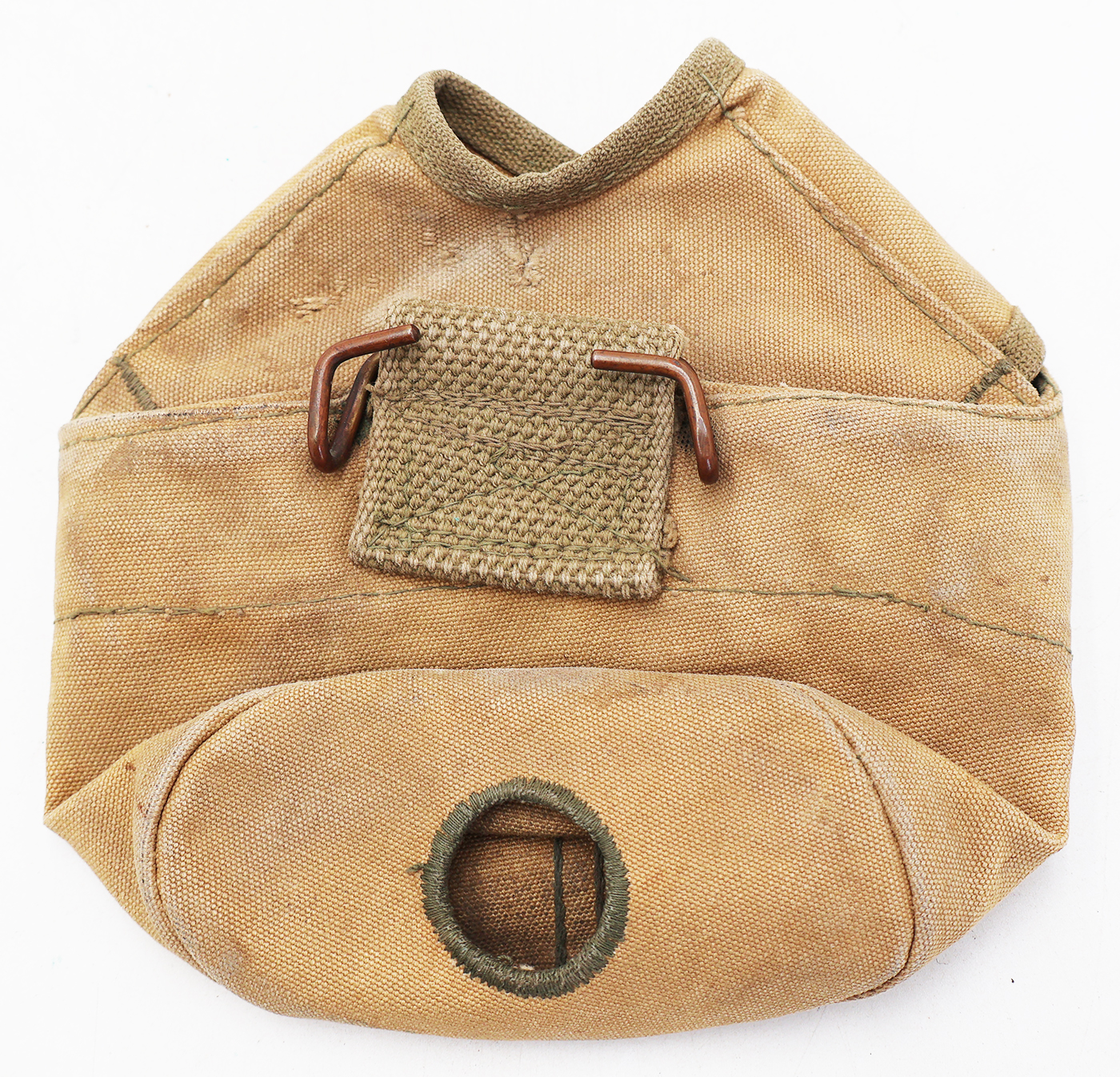 WWII 3rd Pattern USMC Canteen Cover. Khaki Cotton/canvas body is good condition with wear and staining from usage. Cover has the drain hole. No makers marks. Metal hardware is in good condition with one of the snaps having a field repair. The canvas repair was never sewn in, but this does not effect the lift the dot feature (see photos). Cover can still hold weight.