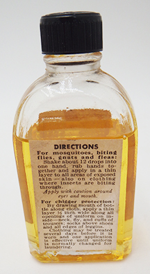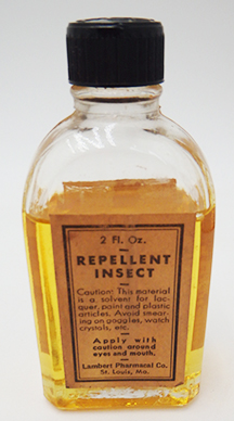 WWII era Insect Repellent. Glass bottle with contents for display only. Bottle is clean and in very good condition. Label is in good condition.