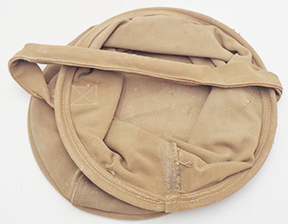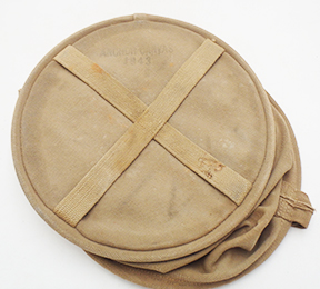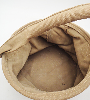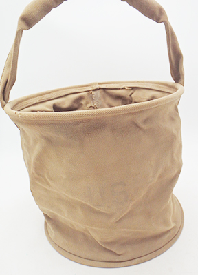 WWII US Army Large size Bucket made of Khaki canvas. 11 inches in diameter. The bucket has some stains, but is otherwise in very good condition and useable. Marked ANCHOR CANVAS 1943.