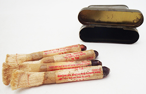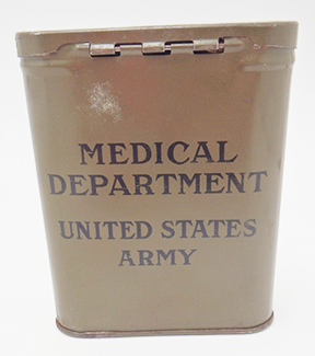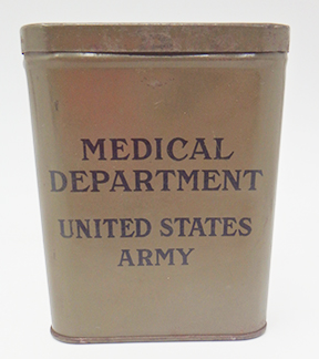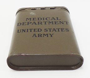 WWII era Medical Department Tin with Iodine Swabs. Tin is in good condition with only minor wear from age. Hinge works well. Comes with 4 iodine swabs that are in good condition. Swabs are for display only.