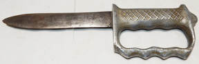 WWII New Zealand Made Aluminum Knuckle Fighting Knife. Cast aluminum body. Just under 11 inches from top to bottom. Has been welll used but still in great shape. Leather sheath has no markings and shows same use as knife.