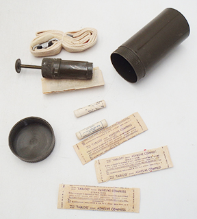 WWII era Snake Bite Kit. Made by Saunders Venom Extractor Co. Tarpon Springs, Florida. OD plastic cylinder with contents. Container has some storage wear. Screw cap does not tighten down completely.