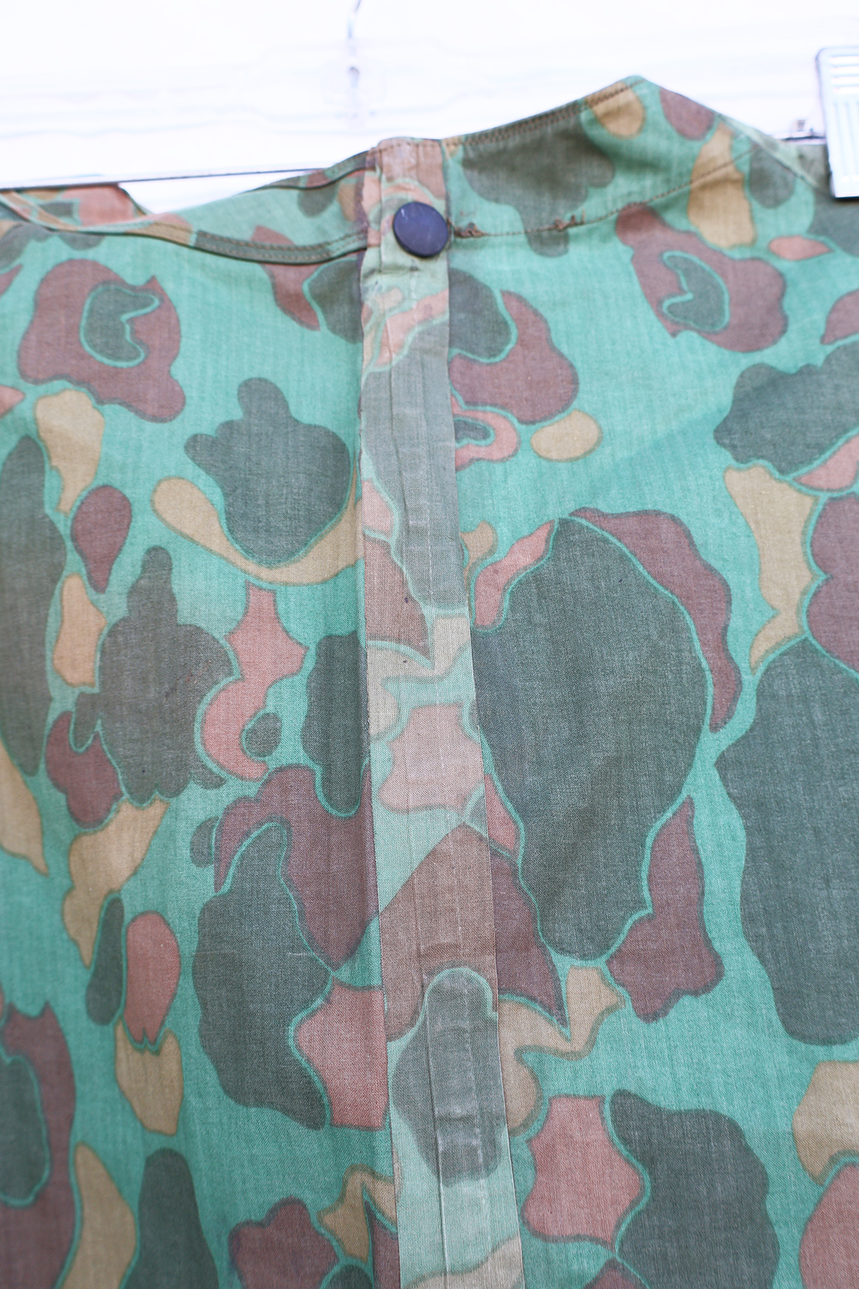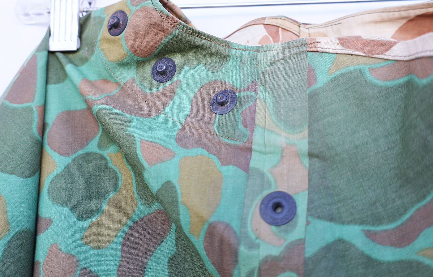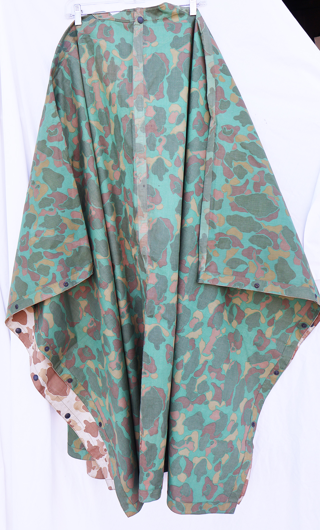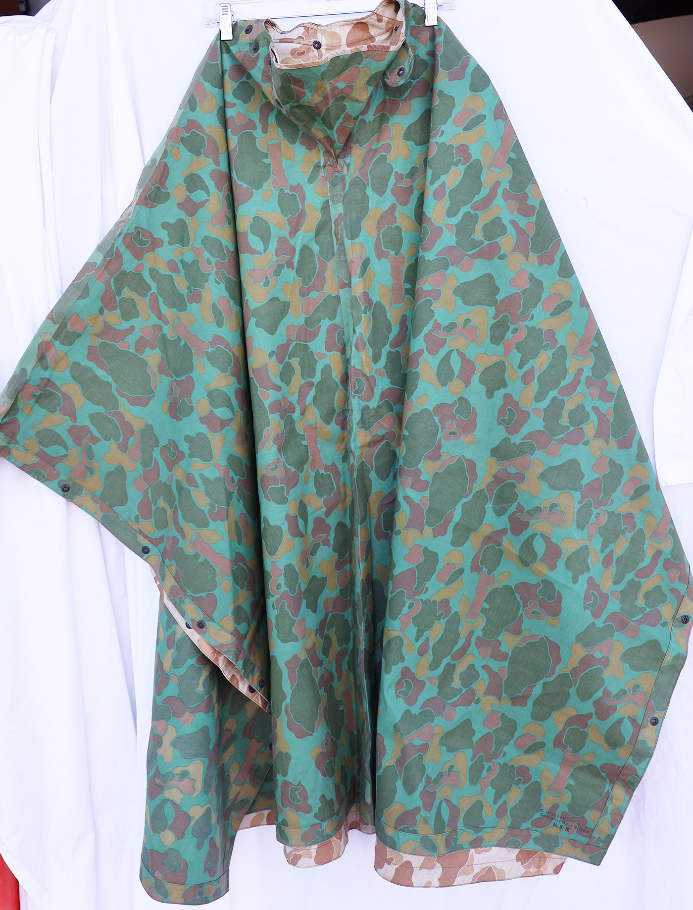 WWII era US Navy Camouflaged Poncho. Rubberized body is still very supple and has just some minor staining from usage. There is a quarter size hole along the front (see photos). Metal hardware is in good shape. Still a usable poncho.