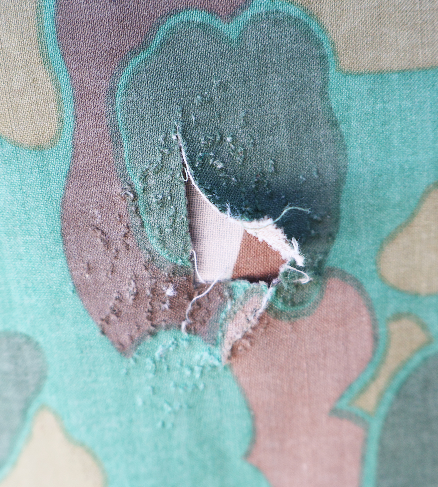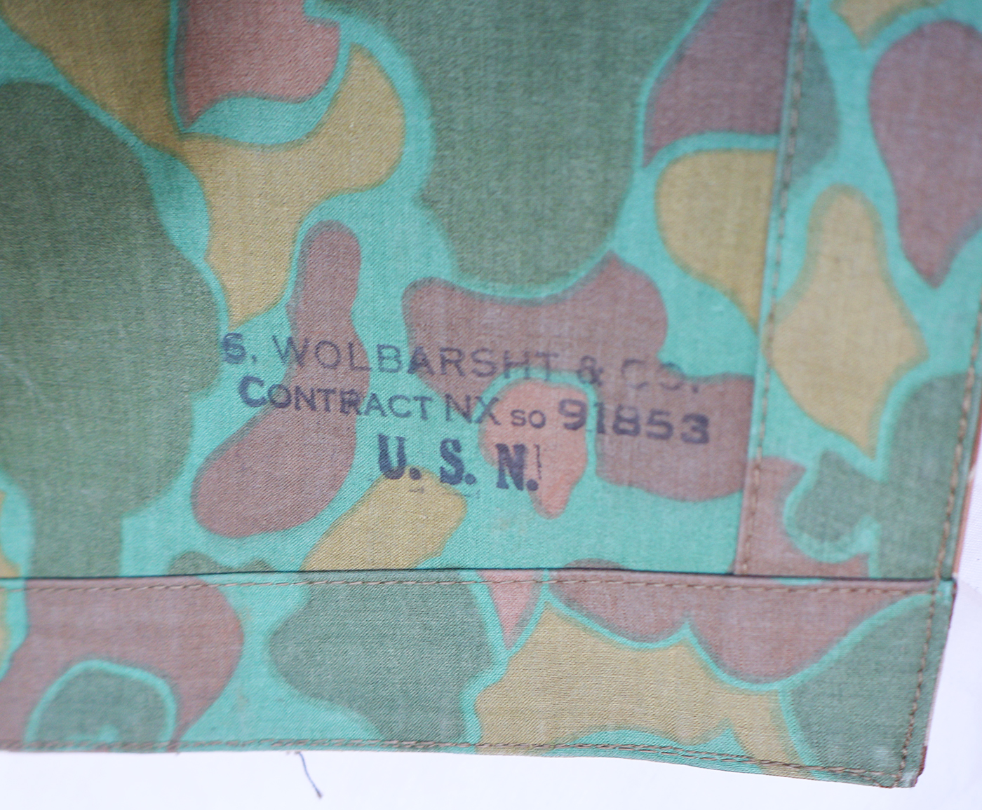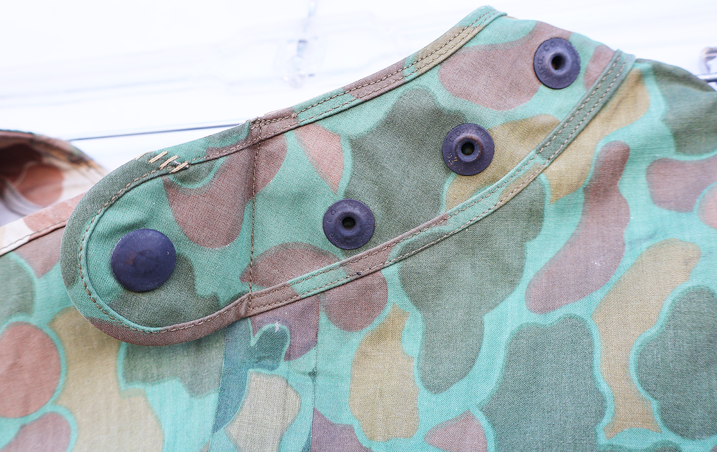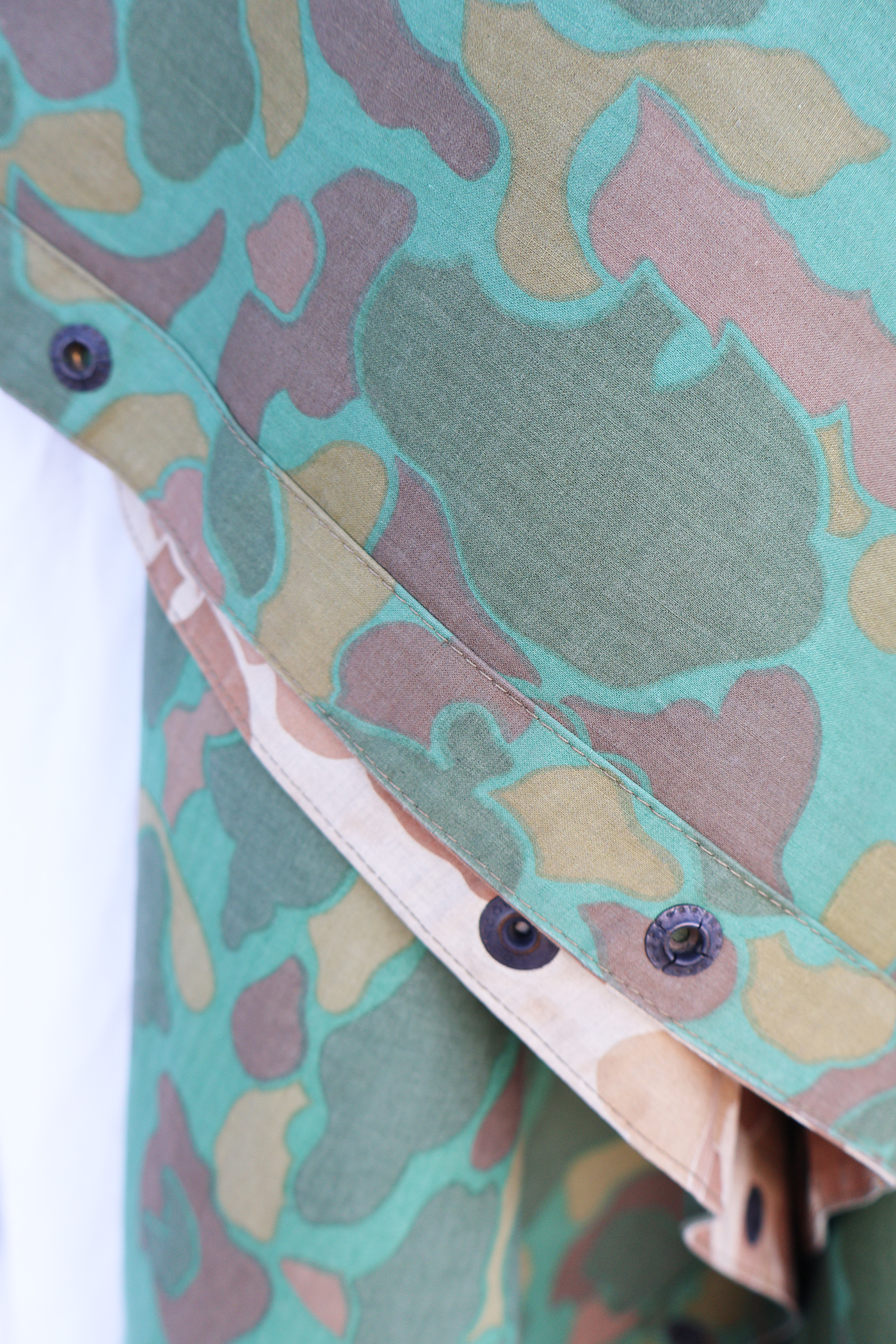 WWII era US Navy Camouflaged Poncho. Rubberized body is still very supple and has just some minor staining from usage. There is a quarter size hole along the front (see photos). Metal hardware is in good shape. Still a usable poncho.