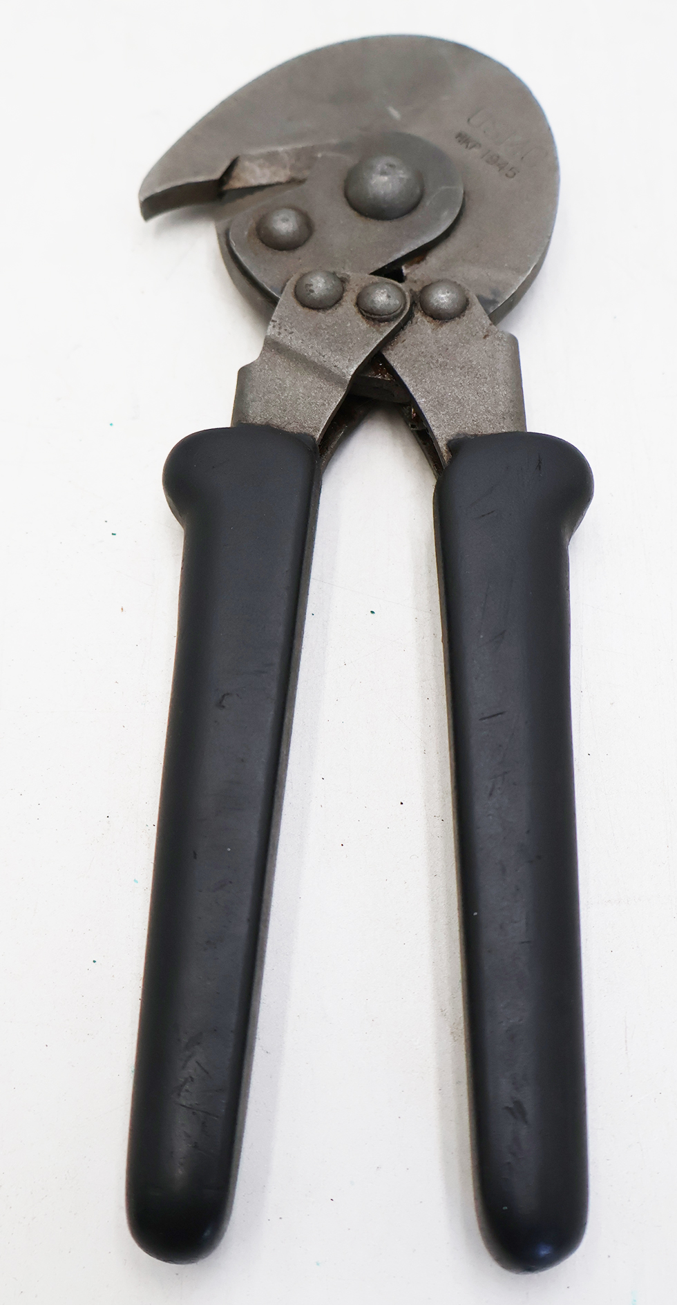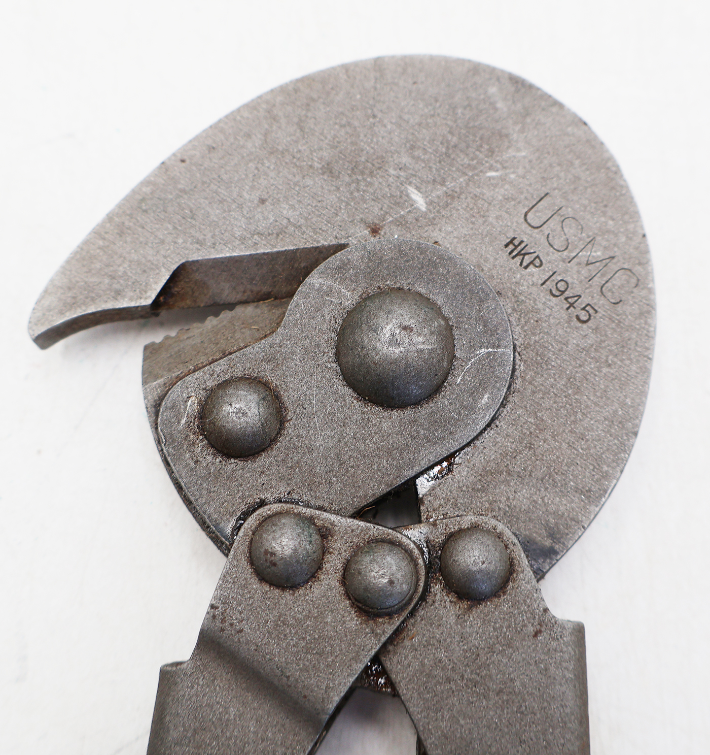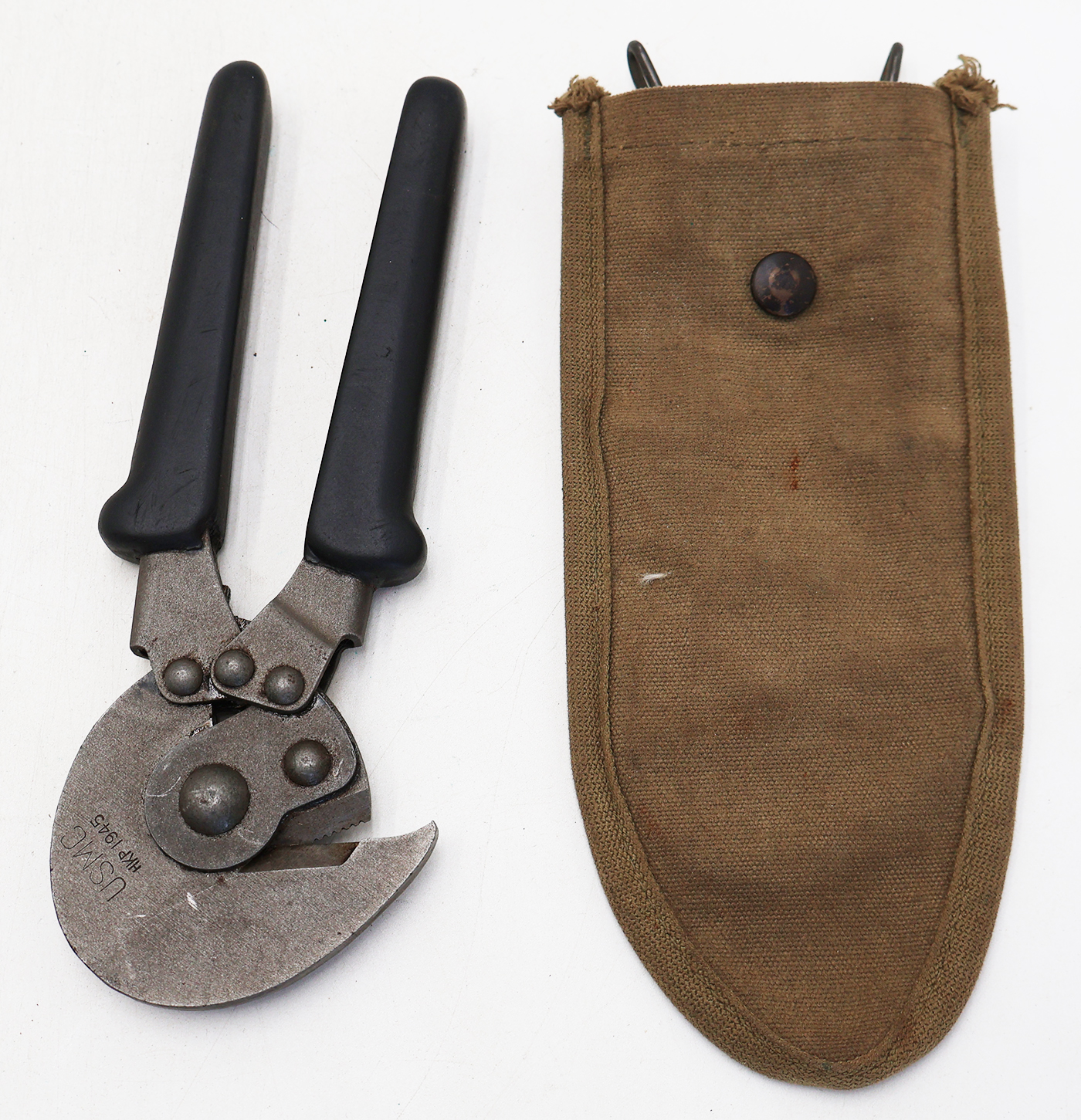WWII era USMC Wire Cutters. Cutters are in very good condition and looks hardly, if ever, used. Cutters are marked HKP 1945. The pouch is in good condition with just minor staining and wear from age. Brass hangar and snap have just minor wear.