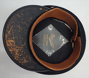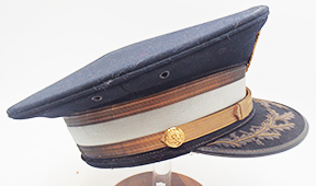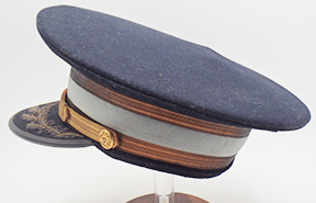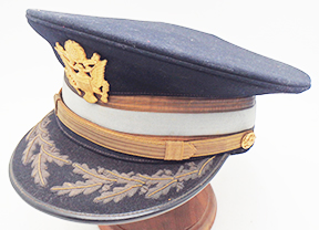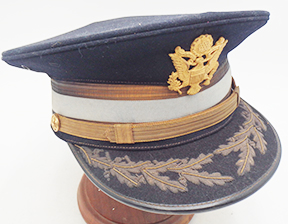WWII US Army Dress Blue Infantry Officers Visor cap. Wool body is clean and in good condition. Insignia is in good condition. All of the bullion is in good condition. Leather bill is in good condition with some minor wear on the underside. The leather sweatband is detached at parts, but intact. The rest of the liner is in good condition. Labelled a size 6 7/8.