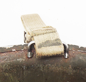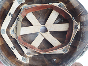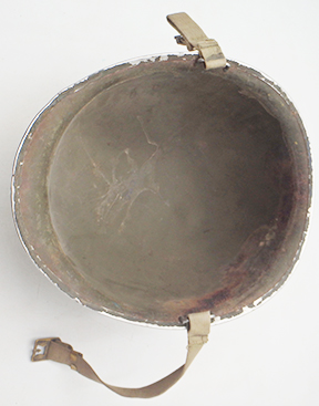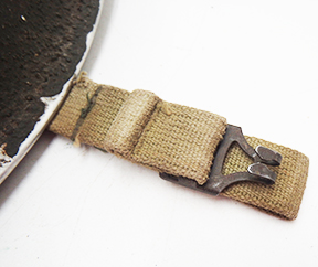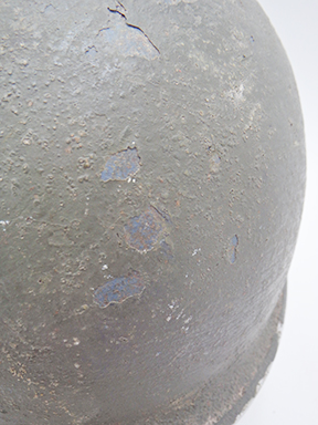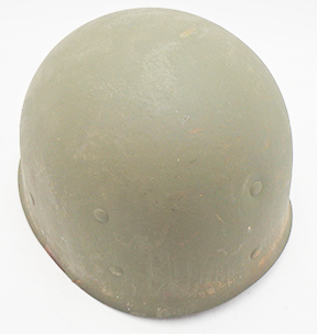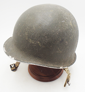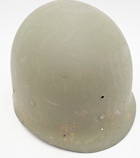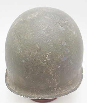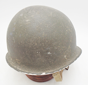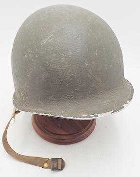 Early war WWII M1 Helmet and Liner Front seam, Fixed bale. The helmet shell is in solid condition with just some wear to the corking and paint. You can see blue paint under the OD suggesting this was once a Navy helmet. Bales are in good condition. The liner is clean and all of the webbing is intact. Liner is a Westinghouse early high pressure. The leather liner chinstrap is missing. The chinstraps is khaki and has some minor wear and damage. The hook part of the chinstrap is a late war replacement. The metal hardware is overall clean with minor rust. The metal front seam is intact. Overall in decent condition.