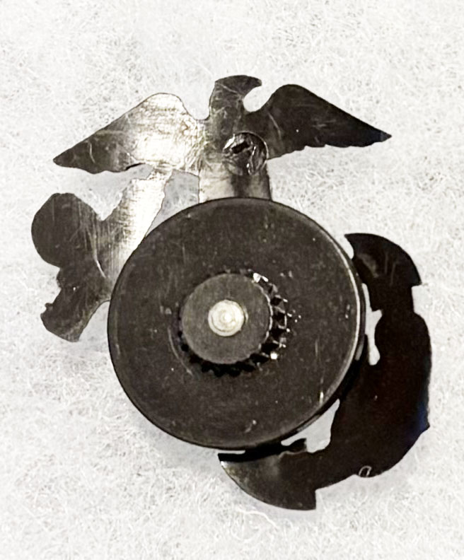 WWII War Economy US Marine Corps Plastic Enlisted Cap Badge. About an inch and a half tall. 37 pattern cap badge. Plastic Construction and screw post. Unused.