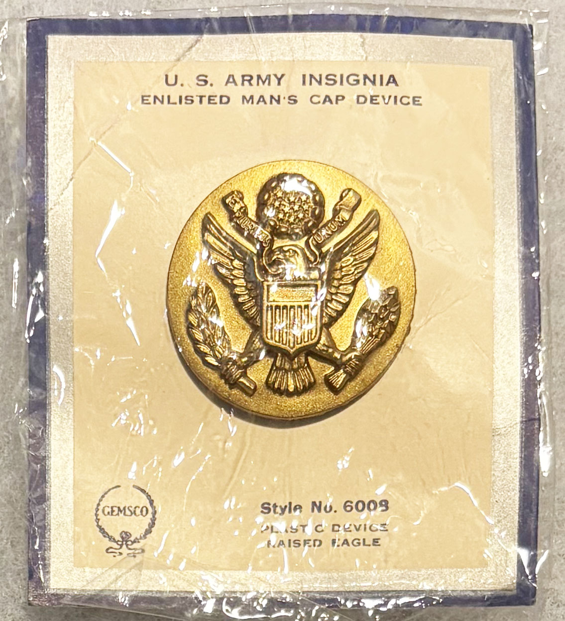 WWII New Old Stock War Economy Army Enlisted Cap Badge. Badge is about an inch and a half in diameter. Plastic body and screw post, with a painted finish. Still on it's original GEMSCO manufacturers Card. Unused.