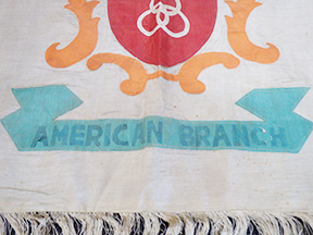 WWII Chinese Made China Executive Headquarters American Branch Unit Flag. About 27 by 39 inches. Chinese raw silk construction with silk fringe around the edges. The enter is the Chinese Executive patch that is made in multi-piece construction and sewn to the flag. One sided so it was meant to have on the wall in the US Branch headquarters. There are a few small foxing spots but overall excellent. Has been folded for a long time. We can only imagine how many OSS meetings were held where this flag hung. Truly a rare, one-of-a-kind CBI theatre flag.
