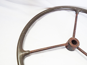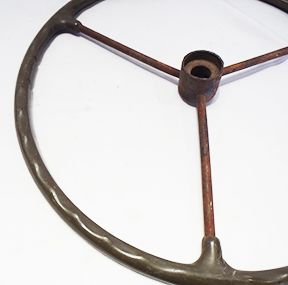 Jeep steering wheel in solid condition. The OD paint on the rim of the wheel is in good shape. The spokes and center have some surface rust, but can easily be cleaned up and painted. The rim has crack at one spot, but the integrity of the wheel is unaffected. Perfect for your jeep restoration.