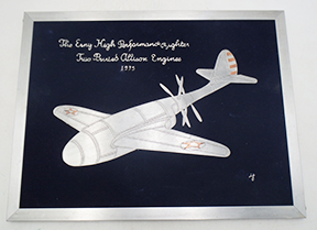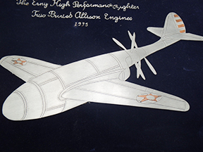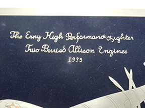 WWII era The Enny High Performance Fighter Concept Trench Art. Aluminum frame and image on a blue velvet background. The frame is in good condition with very little wear. Some of the lettering is a bit worn and bent in a few spots. Overall in good condition. 1935 dated. Says "The Enny High Performance Fighter, Two Buried Allison Engines." Frame measures 12.5 x 9.5 inches.