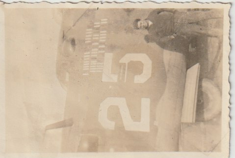 B-24 Bomber 484th Bomb Group with Bomb Missions Painted Photo. Black and white. Measures approx. from 2 1/2 by 3 3/4 inches. Rough/scalloped edge. The photo shows plane number 25, with missions painted on the fuselage below the pilot's window. Some of the bombs are dark. On the back is written "Duplicate Jan 1945 Old #25. She had over 800 combat hours and what a history. Alpern a refueling crewman is standing beside her. B24 Squadron 484th Bomb Group."