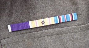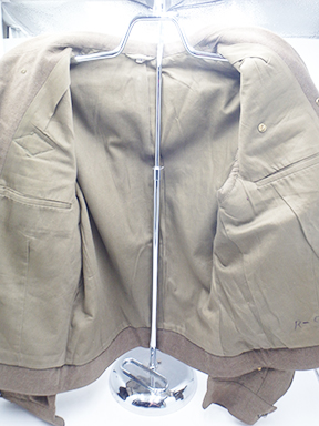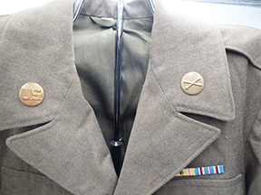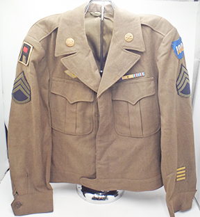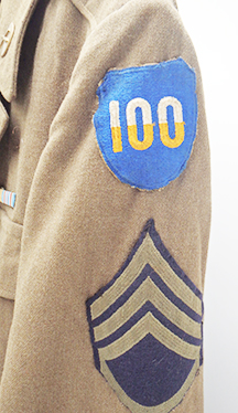 WWII US Army 100th Infantry Division with Artillery Patch Ike Jacket. Artillery patch is a US Made, multi-piece wool. Some very minor mothing and stains on the jacket. Overall in good condition. Jacket is a size 40R.