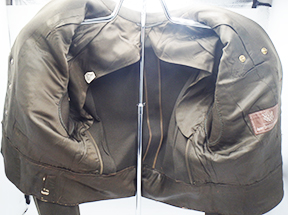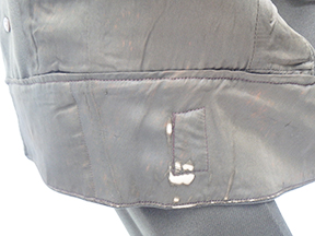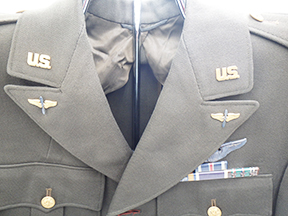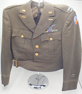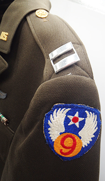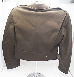 WWII US Army 9th Air Force Officers Cut Down Ike Service Coat. Has the 9th Air Force patch on the left. The brass belt buckle is in good condition. Has only one Captain's bar on the left shoulder. Jacket is in good condition with some wear from usage. Jacket measures shoulder to shoulder 18 inches, front chest size 19 inches, sleeve length 23 inches and top of the neck to the base of the jacket is 22 inches.