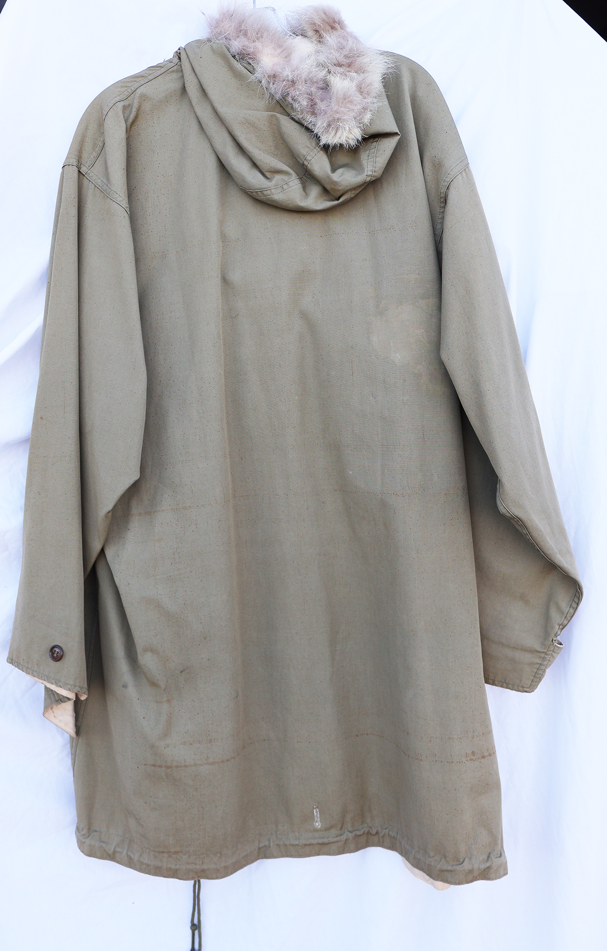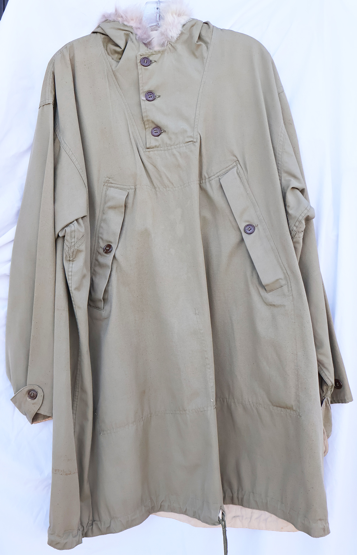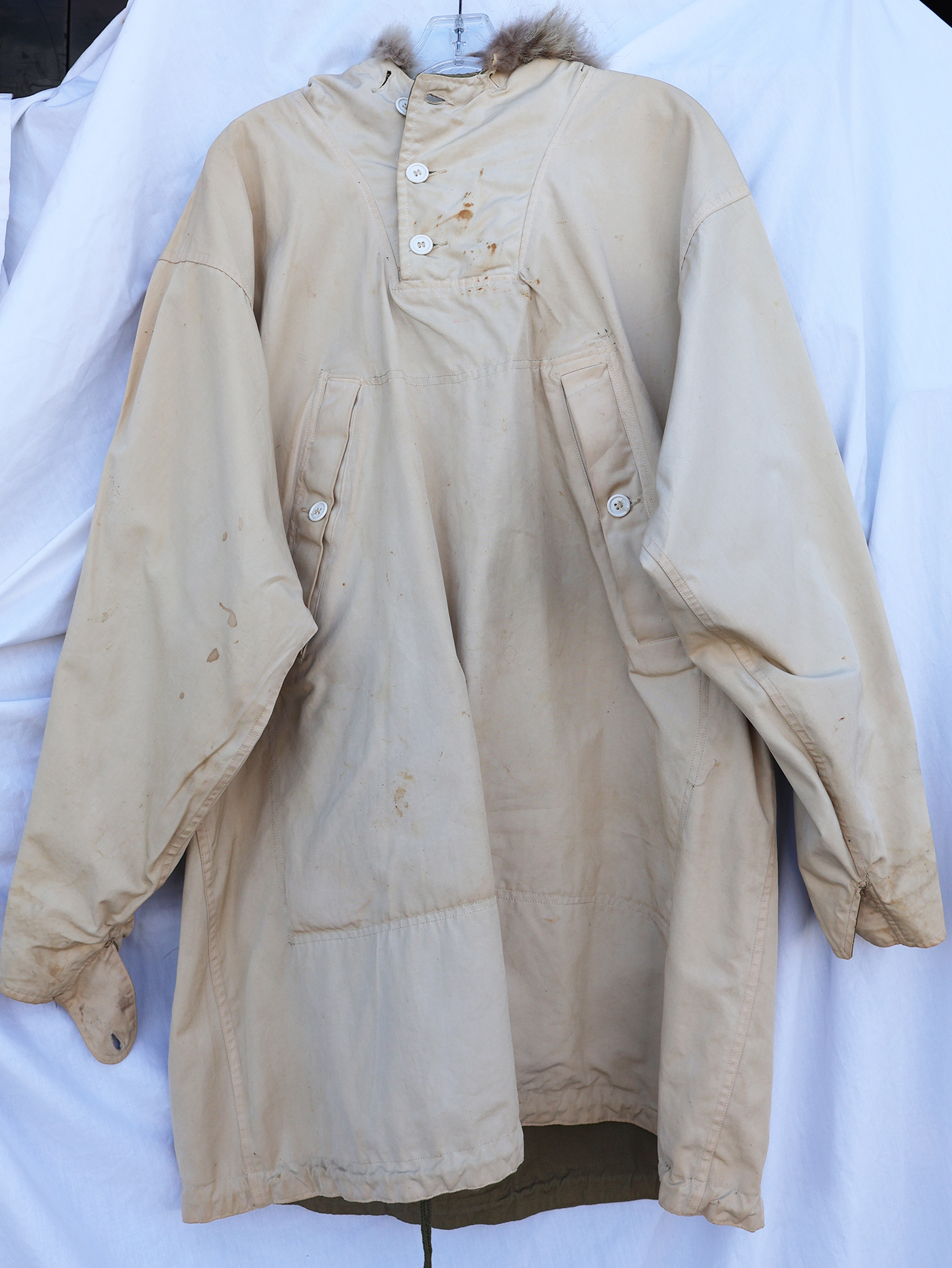 WWII era US Army Reversible Fur Ski Parka. Cotton Jacket has a few stains from usage with some wear. Fur is in good shape. All of the buttons are intact. Overall the jacket is in good condition with no notable damage or holes. Labelled a size medium.