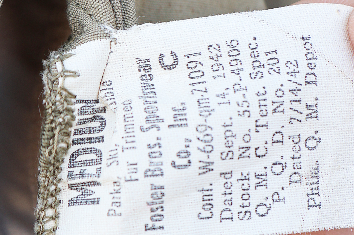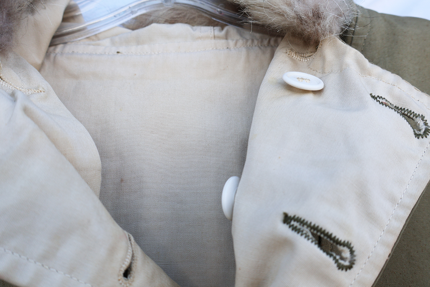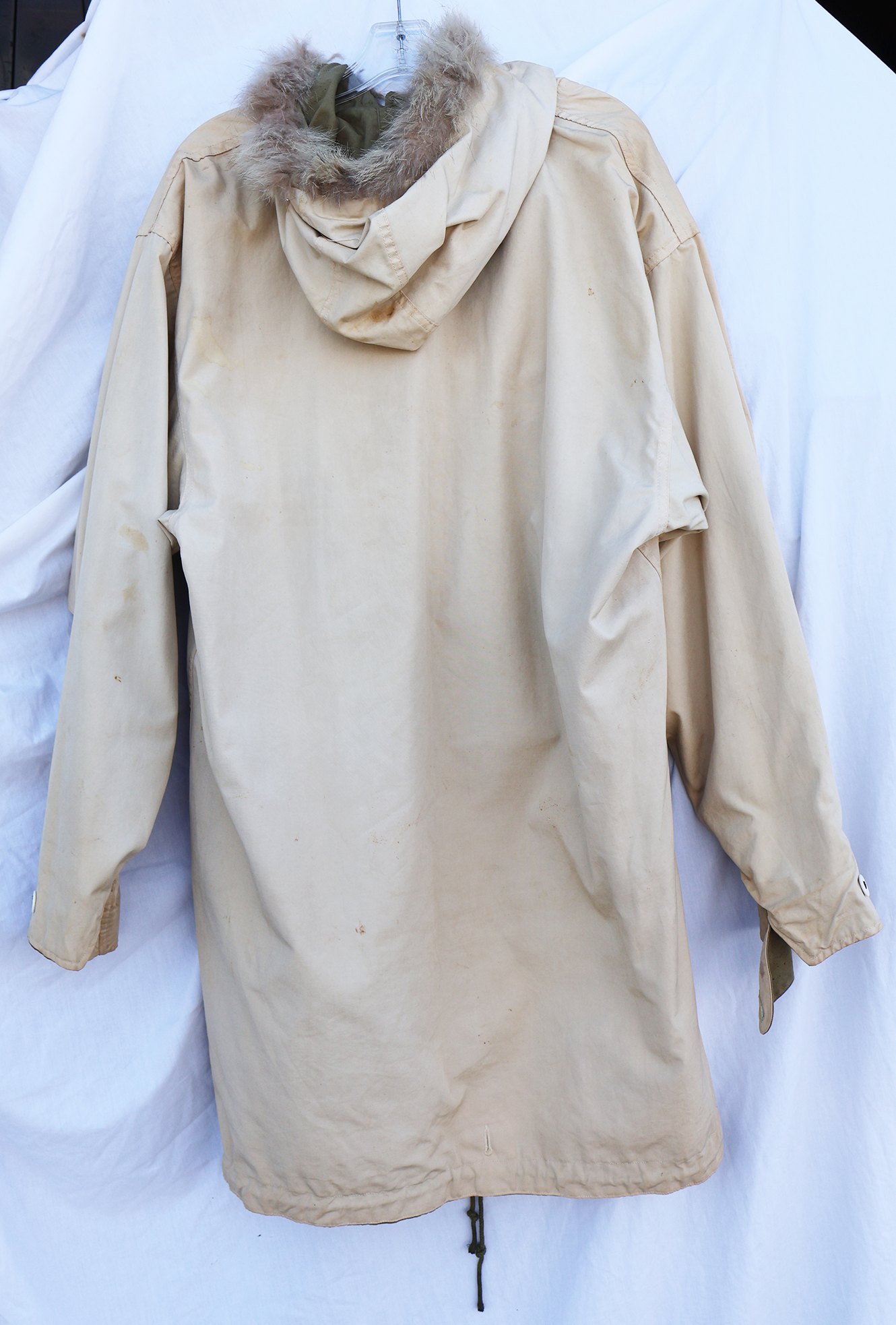 WWII era US Army Reversible Fur Ski Parka. Cotton Jacket has a few stains from usage with some wear. Fur is in good shape. All of the buttons are intact. Overall the jacket is in good condition with no notable damage or holes. Labelled a size medium.