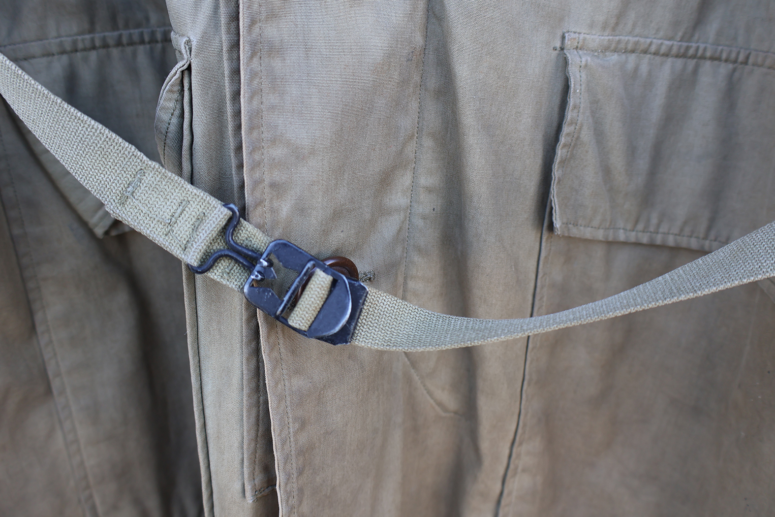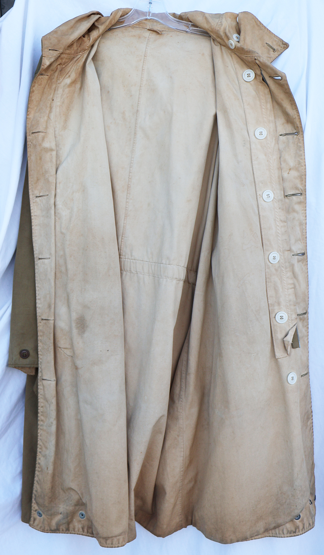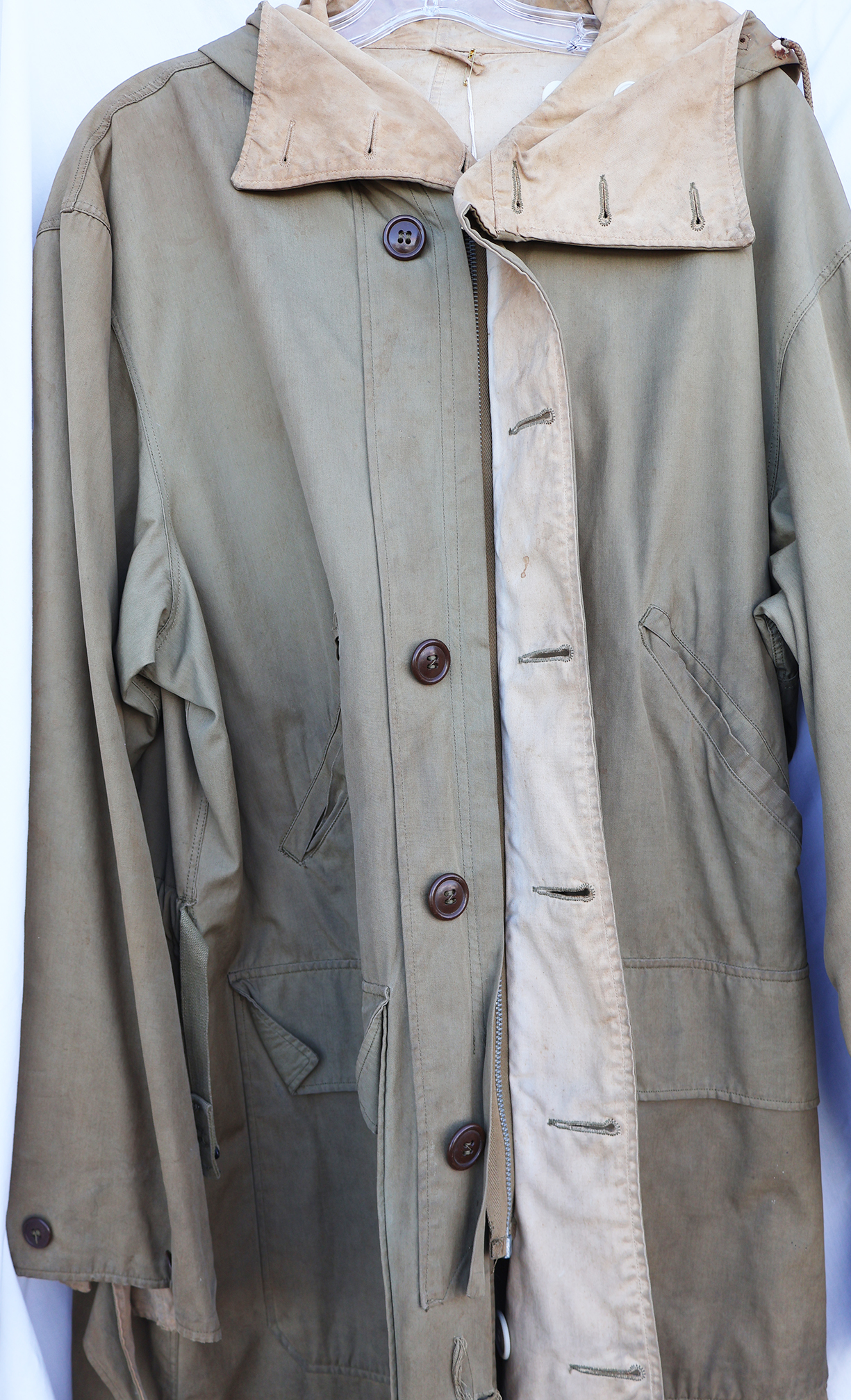 WWII era US Army Reversible Ski Jacket. Cotton Jacket is stained from usage with some wear. A couple of the breast buttons are missing. Overall the jacket is in solid condition with no notable damage or holes. Built in belt is in good condition. Measures 21 inches from shoulder to shoulder and 23 inches across the chest.