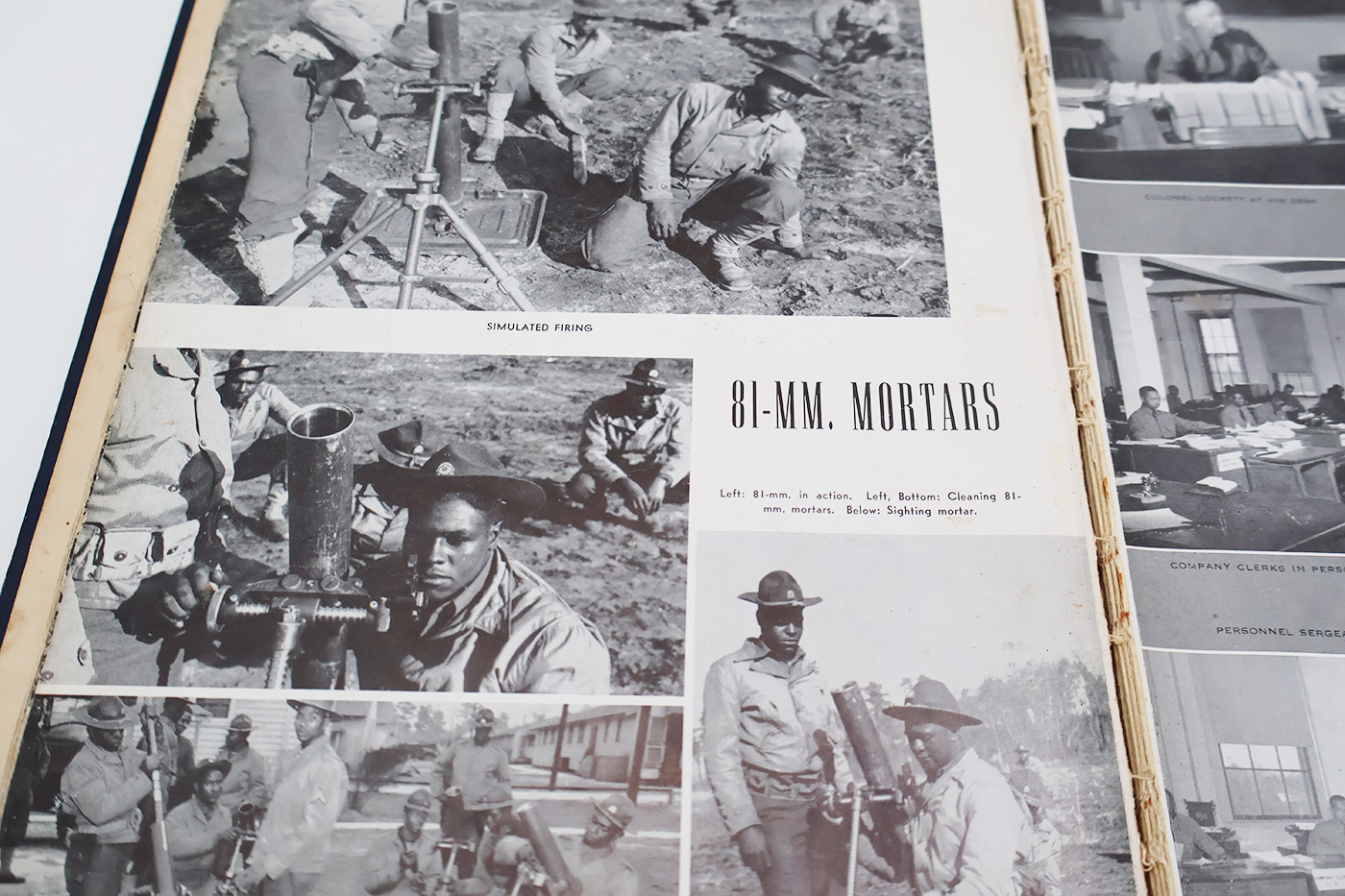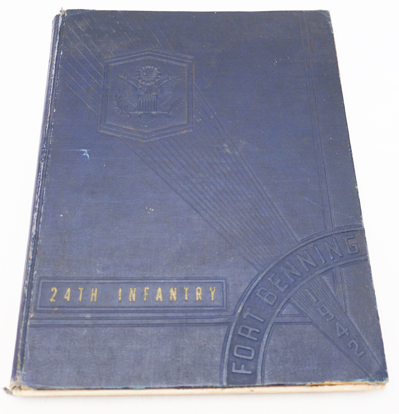 WWII 24th Infantry Regiment, Fort Benning 1942 Yearbook. The book cover and pages are worn with age. The binding is split, but overall intact. The book is 1942 dated. First Edition. Named to a member of the Anti-tank Company. The book contains approx. 102 pages.