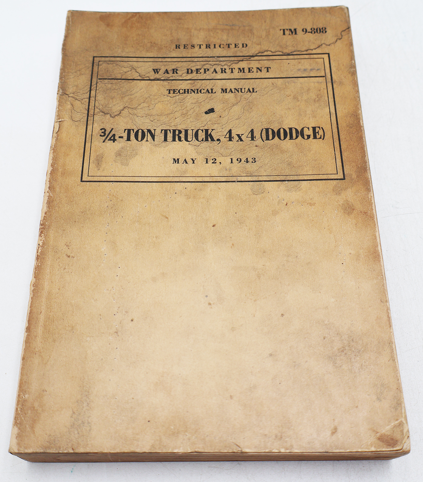 WWII US War Department Manual Handbook On 3/4 Ton Truck, 4x4 (Dodge). Softbound. Dated 1943. Marked TM 9-808. Over 505 pages. Lots of great illustrations and photos. Wear to the cover, but pages and binding are strong. No torn or missing pages.