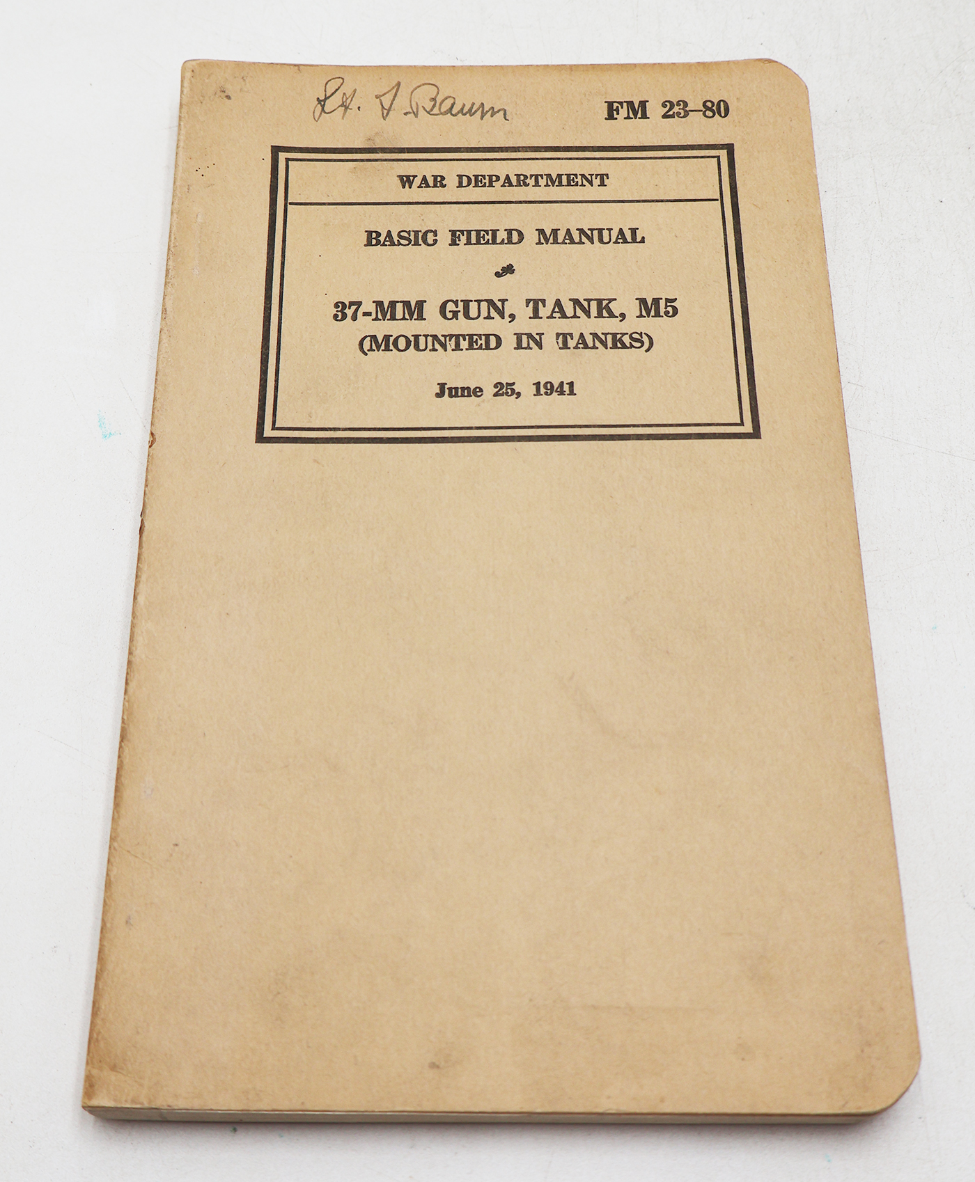 WWII US War Department Manual Handbook On 37-mm Gun, Tank, M5. Softbound. Dated 1941. Marked FM 23-80. 153 pages. Lots of great illustrations and photos. Shows minor storage wear. No torn or missing pages.