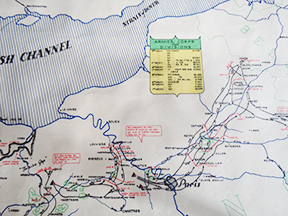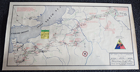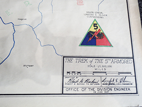 WWII era 5th Armored Division Unit History Map. Was framed at one point and is glued to white backing. Will be shipped on the backing as it cannot be removed without risk of damage. In good condition with some wear around the edges. Measures 15 x 29 inches.