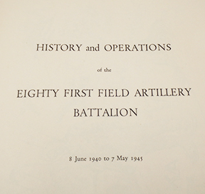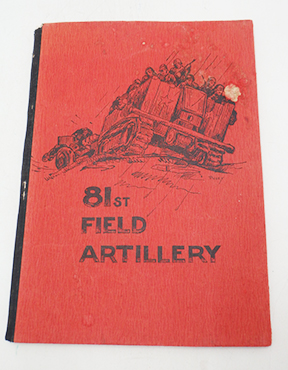 WWII era 81st Field Artillery Battalion Unit History. The book cover and pages are worn with age, but the binding is strong. The book is 1945 dated. First Edition. The book contains approx. 54 pages.
