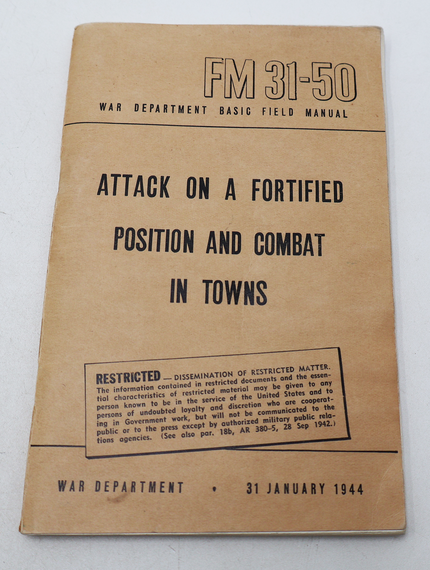WWII US War Department Manual Handbook On Attack On A Fortified Position and Combat in Towns. Softbound. Dated 1944. Marked FM 31-50. 124 pages. Lots of great illustrations and photos. Wear to the cover, but pages and binding are strong. No torn or missing pages.