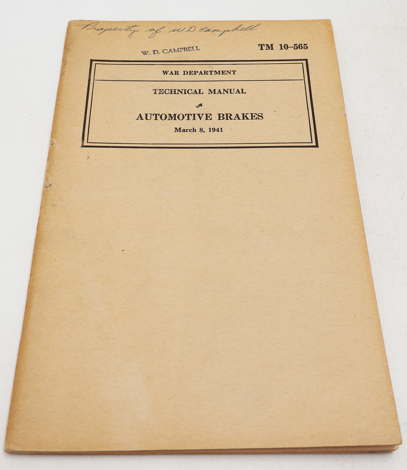 WWII US War Department Manual Handbook On Automotive Brakes. Softbound. Dated 1941. Marked TM 10-565. Over 81 pages. Lots of great illustrations and photos. Shows minor storage wear. No torn or missing pages.