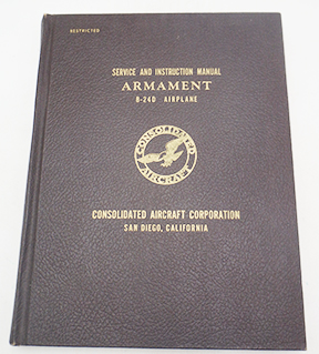 WWII B-24D Liberator Armament Manual. Hardbound. Printed in 1943. 184 pages. Written by Consolidated Aircraft Corporation in San Diego, CA. Both the cover and pages are in great shape with no torn or missing pages. Great graphics and imagery inside.