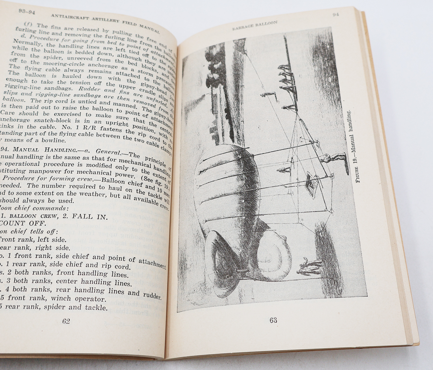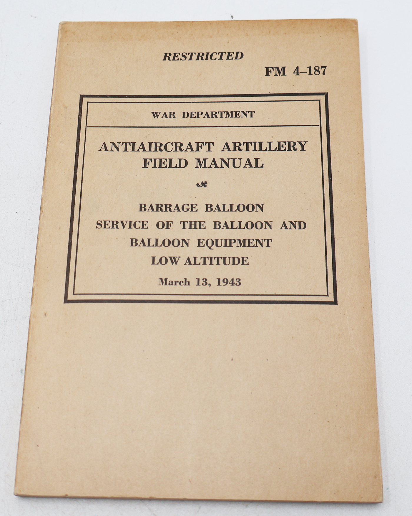 WWII US War Department Manual Handbook On the Barrage Balloon. Softbound. Dated 1943. Marked FM 4-187. 166 pages. Lots of great illustrations and photos. Minor wear to the cover, but pages and binding are strong. No torn or missing pages.