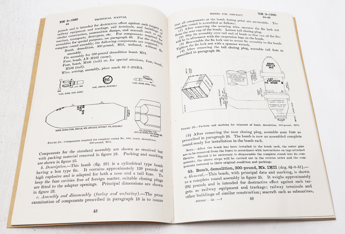 WWII US War Department Manual Handbook On Bombs for Aircraft. Softbound. Dated 1942. Marked TM 9-1980. 112 pages. Lots of great illustrations and photos. Wear to the cover, but pages and binding are strong. No torn or missing pages.