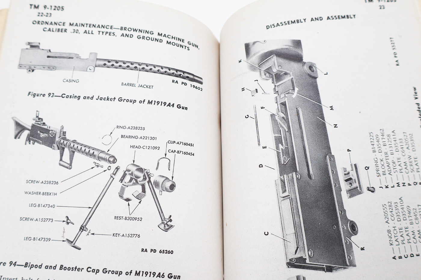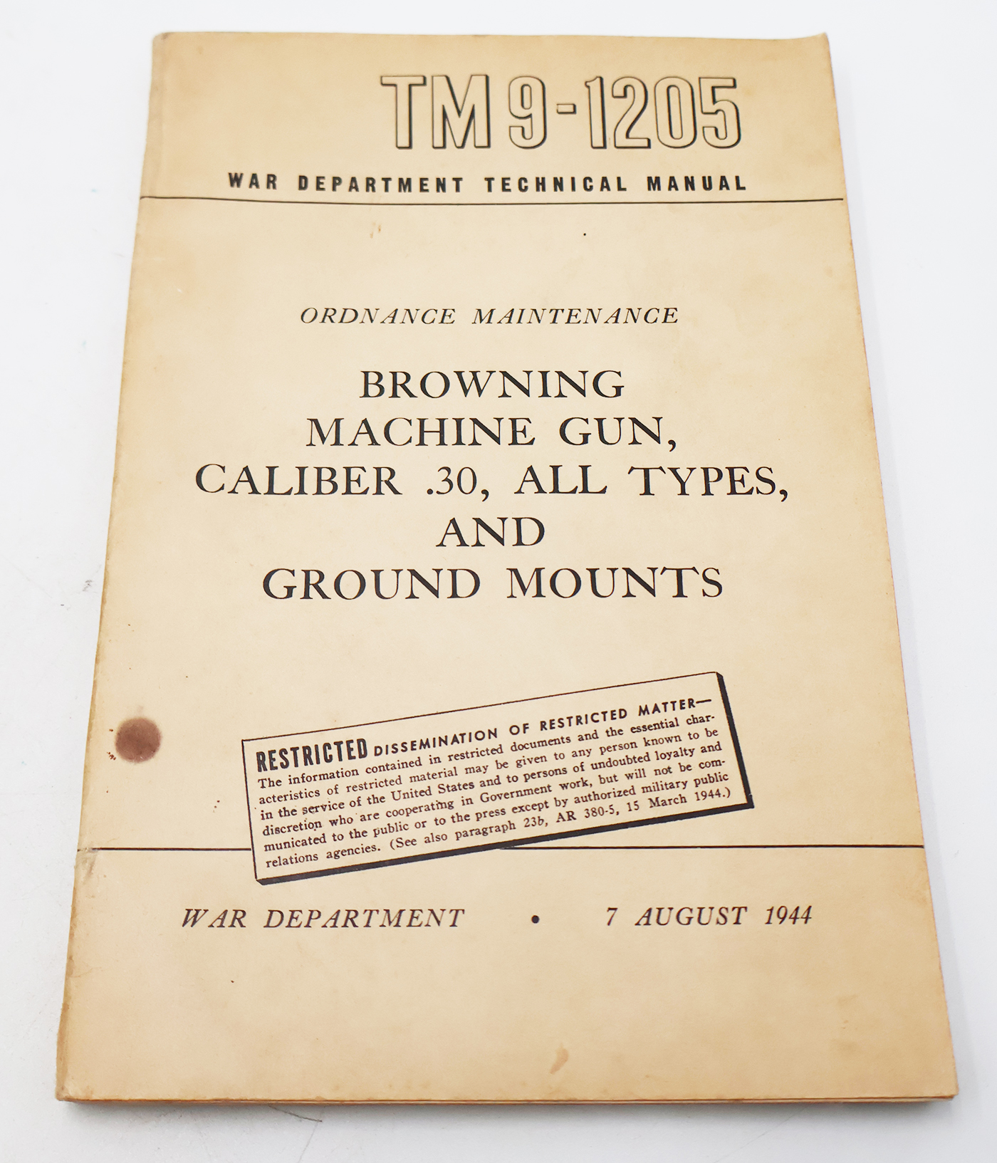 WWII US War Department Manual Handbook On the Browning .30 Cal Machine Gun. Softbound. Dated 1944. Marked TM 9-1205. 151 pages. Lots of great illustrations and photos. Wear to the cover, but pages and binding are strong. No torn or missing pages.