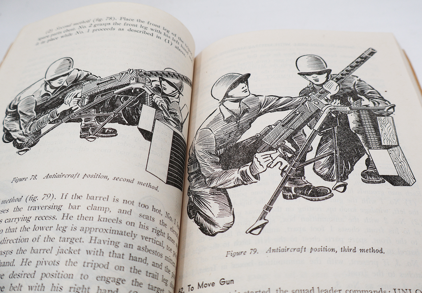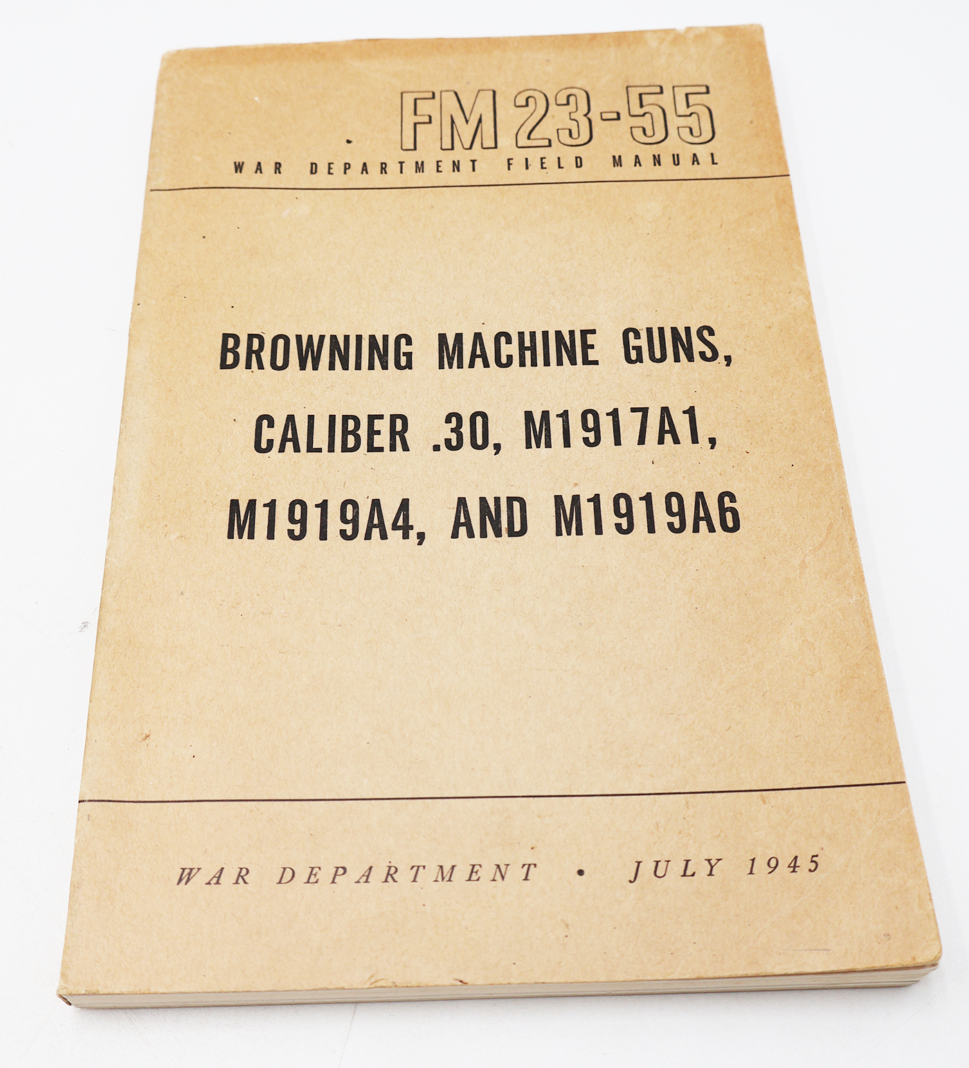 WWII US War Department Manual Handbook On Browning Machine Guns, Caliber .30, M1917A1, M1919A4, and M1919A6. Softbound. Dated 1945. Marked FM 23-55. 299 pages. Lots of great illustrations and photos. Wear to the cover, but pages and binding are strong. No torn or missing pages.