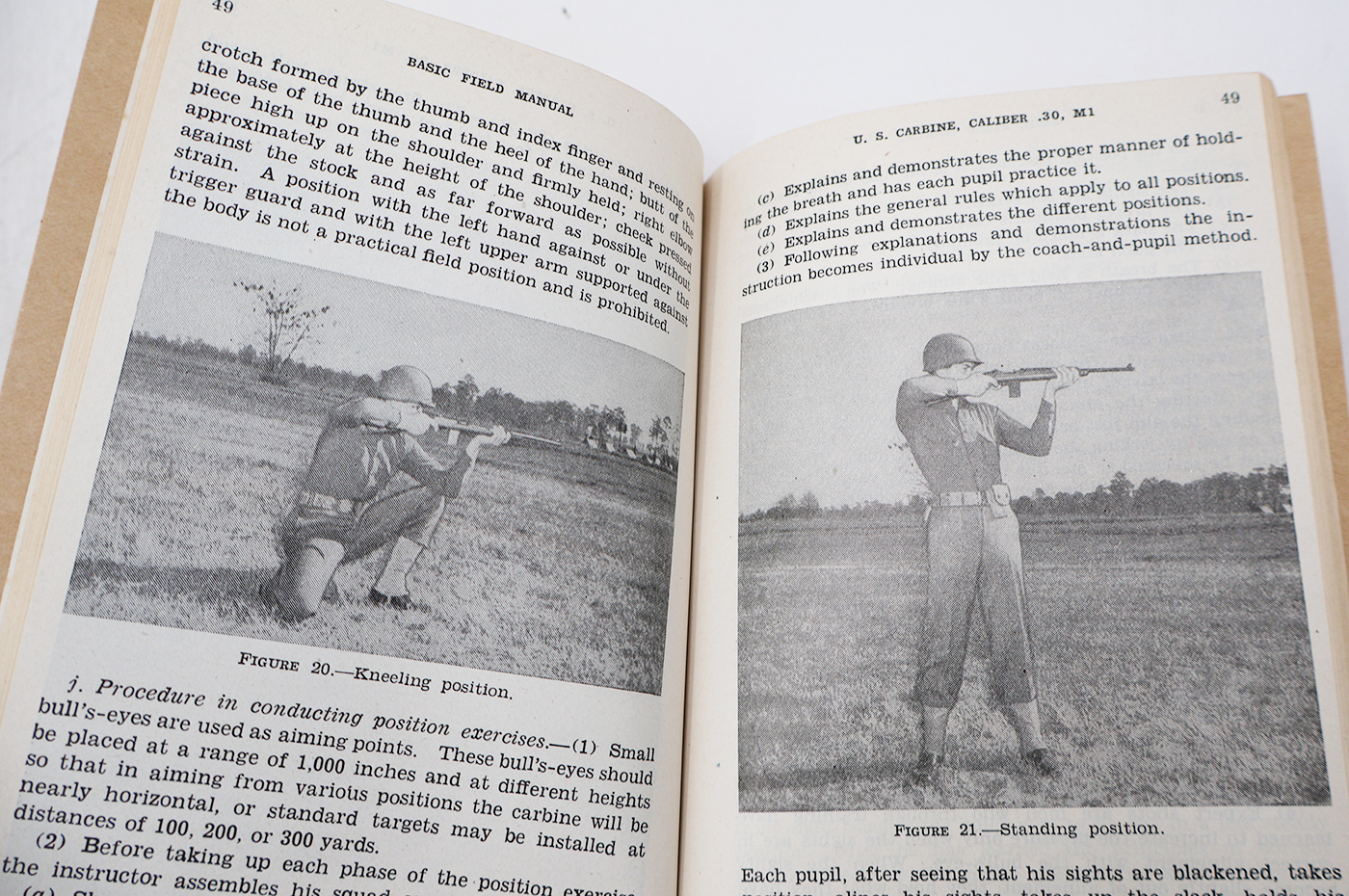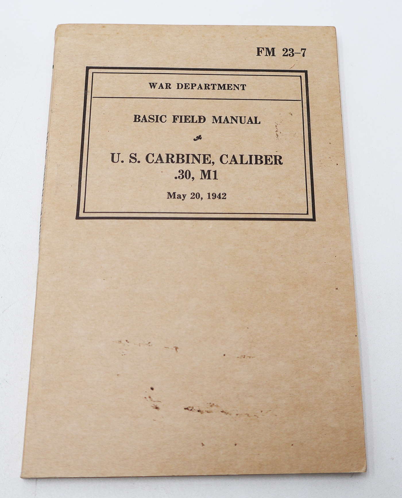 WWII US War Department Manual Handbook On the M1 Carbine. Softbound. Dated 1942. Marked FM 23-7. 140 pages. Lots of great illustrations and photos. Wear to the cover, but pages and binding are strong. No torn or missing pages.