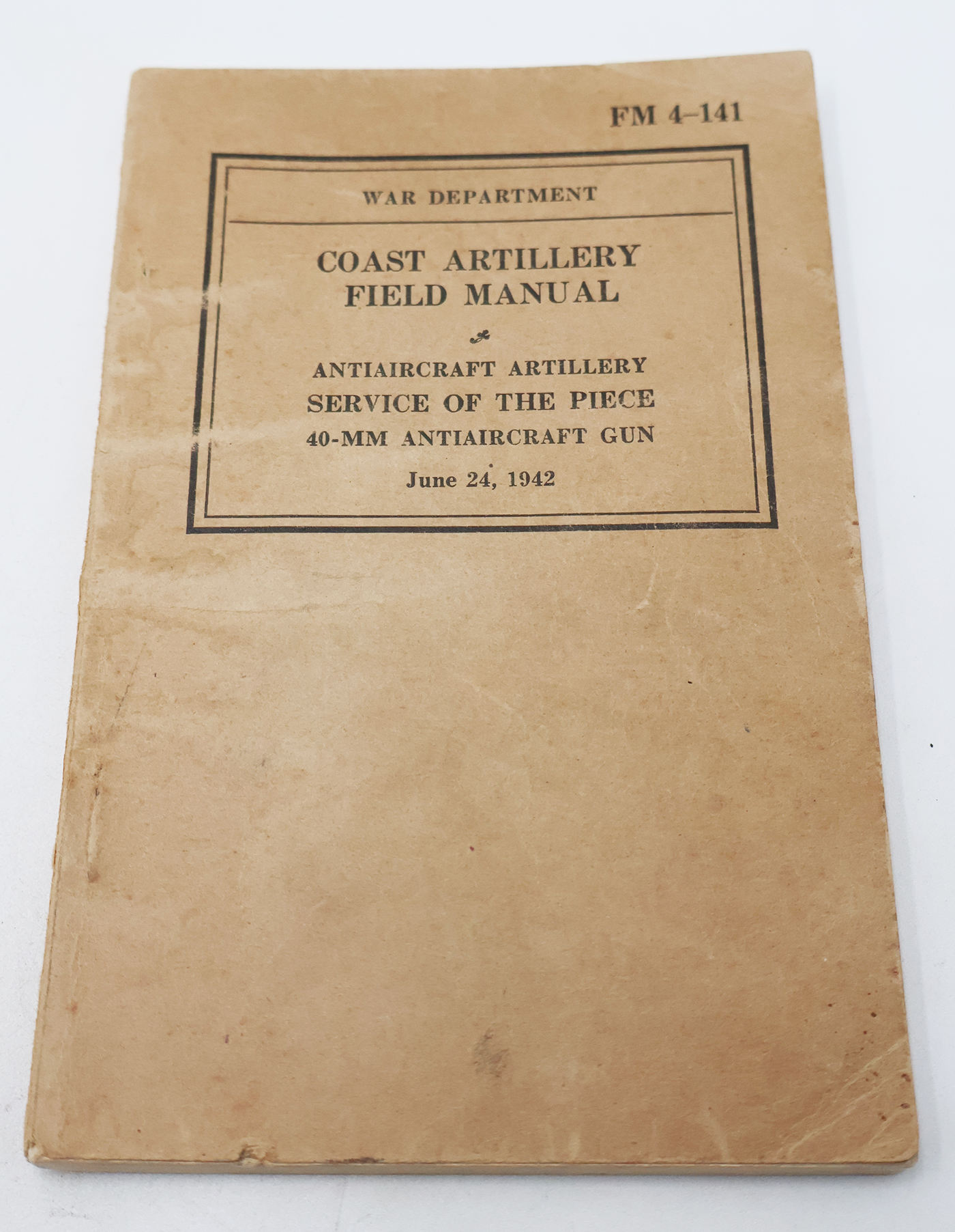 WWII US War Department Manual Handbook On the Coastal Artillery 40 MM Antiaircraft Gun. Softbound. Dated 1942. Marked FM 4-141. 135 pages. Lots of great illustrations and photos. Wear to the cover, but pages and binding are strong. No torn or missing pages.