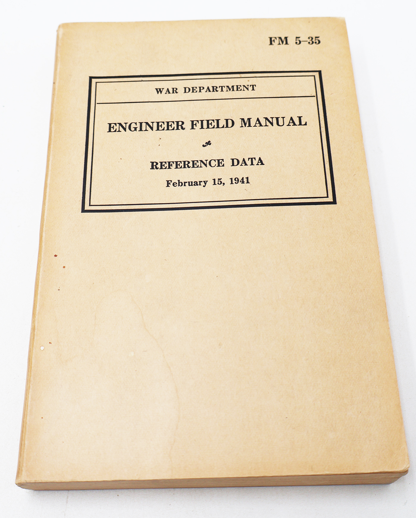 WWII US War Department Manual Handbook On Engineer Reference Data. Softbound. Dated 1941. Marked FM 5-35. 369 pages. Lots of great illustrations and photos. The cover is clean and the pages and binding are strong. No torn or missing pages.