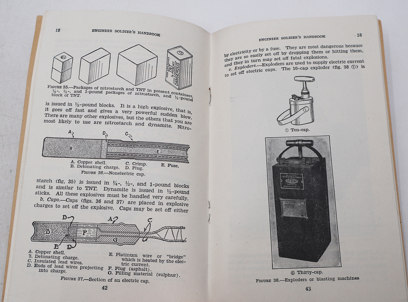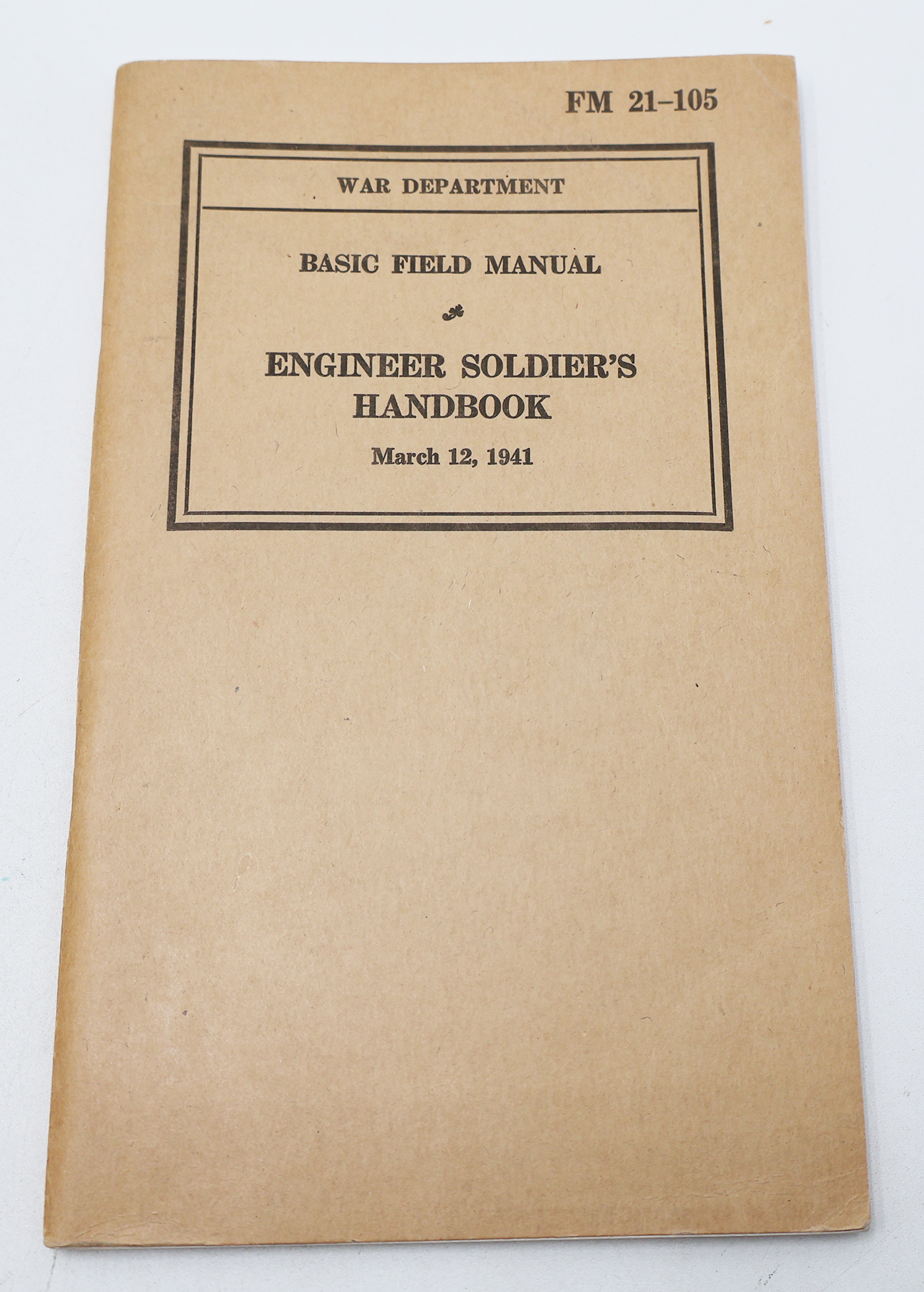 WWII US War Department Manual Engineer Soldier's Handbook. Softbound. Dated 1941. Marked FM 21-105. 90 pages. Lots of great illustrations and photos. Minor wear to the cover, but pages and binding are strong. No torn or missing pages.