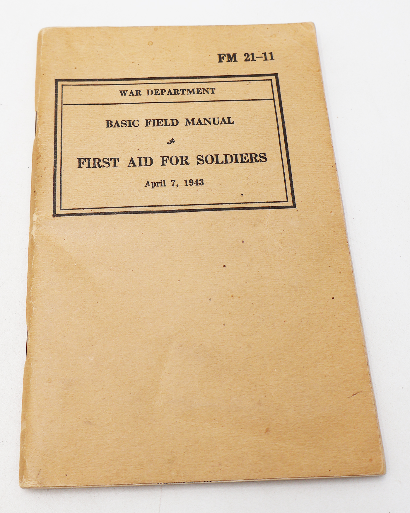 WWII US War Department Manual Handbook On First Aid For Soldiers. Softbound. Dated 1943. Marked FM 21-11. 119 pages. Lots of great illustrations and photos. Wear to the cover, but pages and binding are strong. No torn or missing pages.