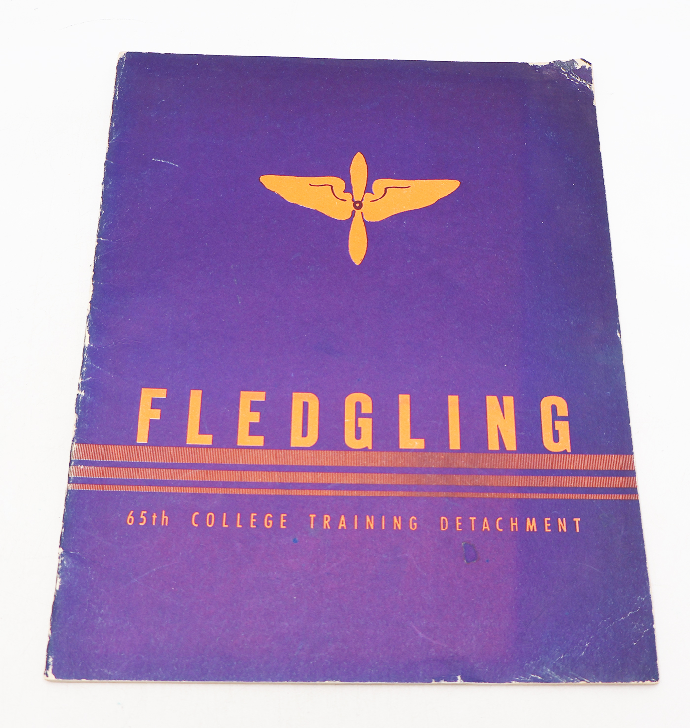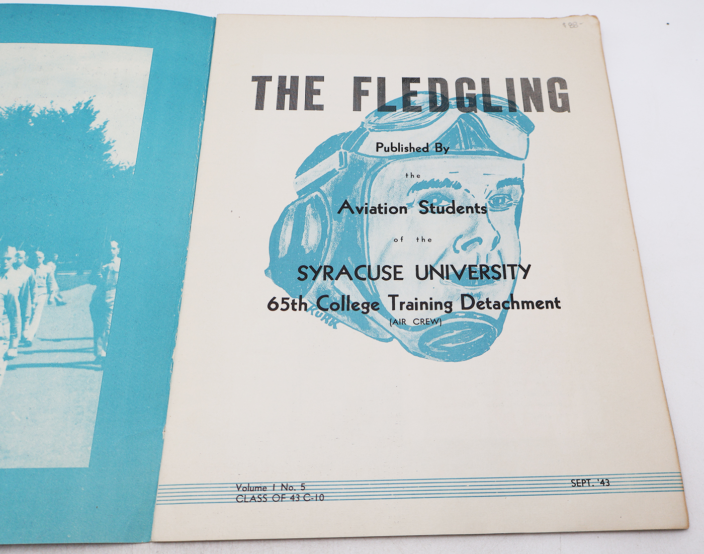 WWII era Fledgling 65th College Training Detachment Syracuse University Magazine. Volume I No.5 The book cover and pages have minor wear and are yellowed from age. Overall in good condition. Lots of Photos and illustrations. The binding is strong. No torn or missing pages. The book is September 1943 dated. The book contains approx. 32 pages.