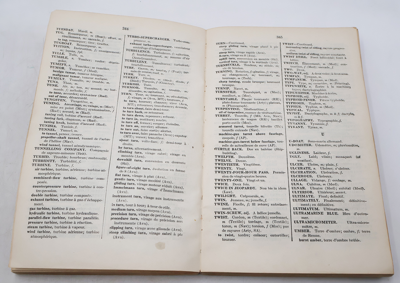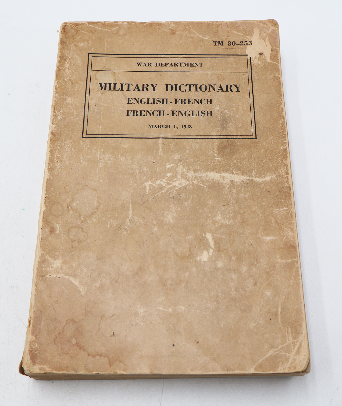WWII US War Department Manual Handbook On French-English Military Dictionary. Softbound. Dated 1943. Marked TM 30-253. 813 pages. Wear from age and usage. No torn or missing pages.