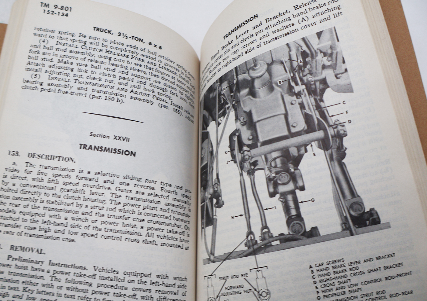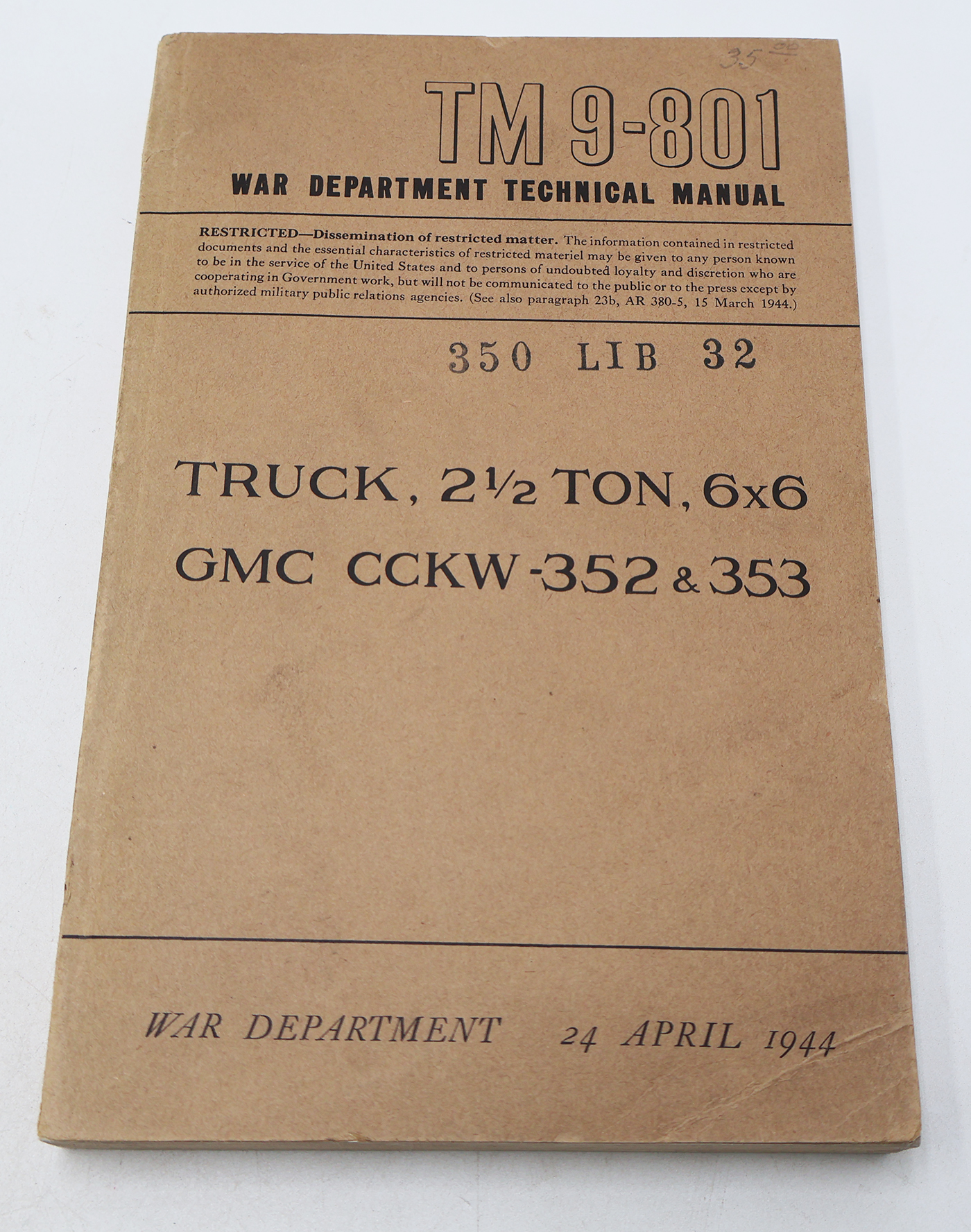 WWII US War Department Manual Handbook on the GMC 2 1/2 Ton "Duce and a Half" Truck. Softbound. Dated 1944. Marked TM 9-801. 480 pages. Lots of great illustrations and photos. Wear to the cover, but pages and binding are strong. No torn or missing pages.