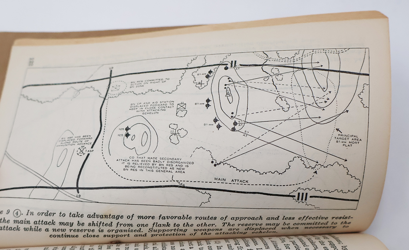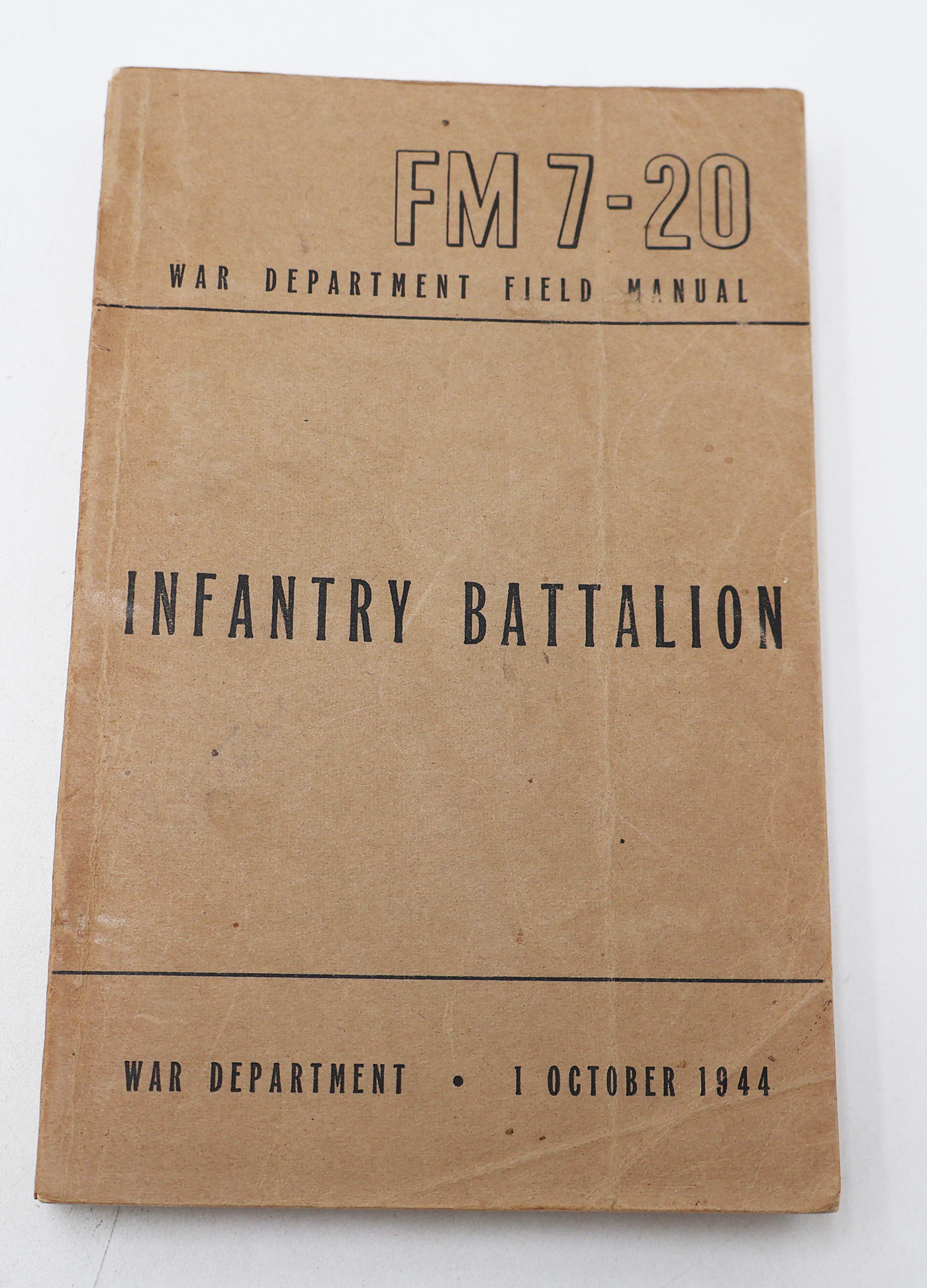 WWII US War Department Manual Handbook On the Infantry Battalion. Softbound. Dated 1944. Marked FM 7-20. 278 pages. Wear to the cover, but pages and binding are strong. No torn or missing pages.